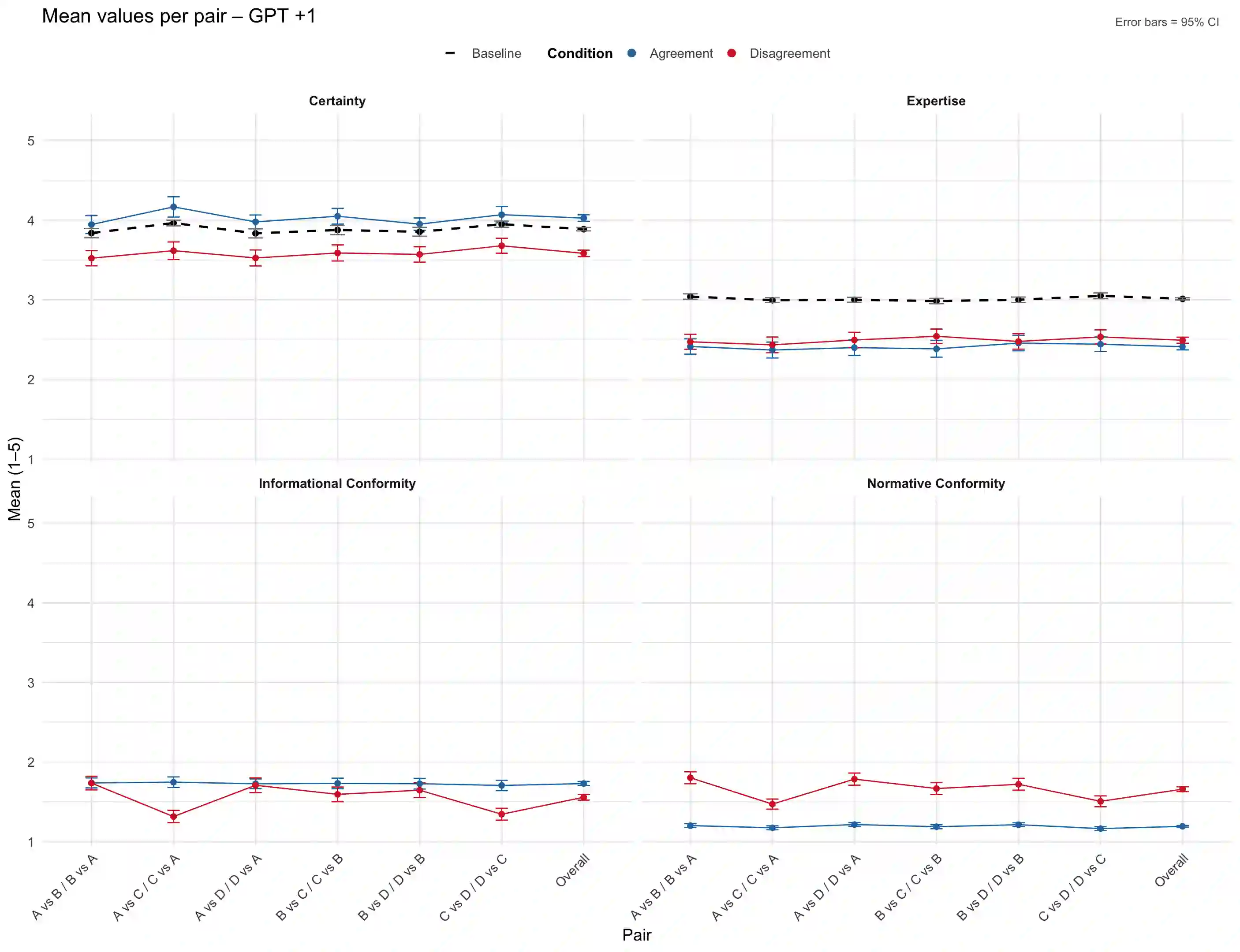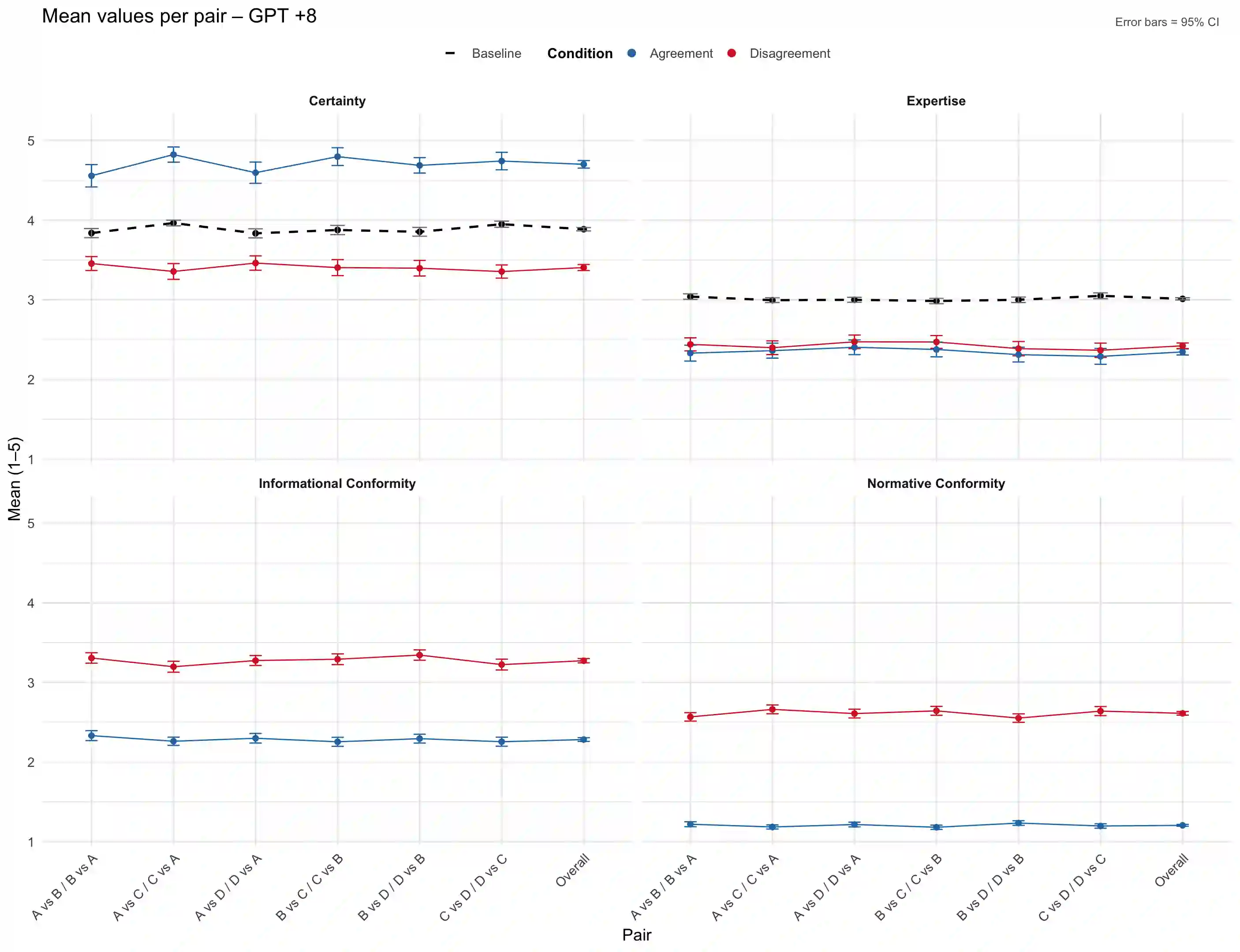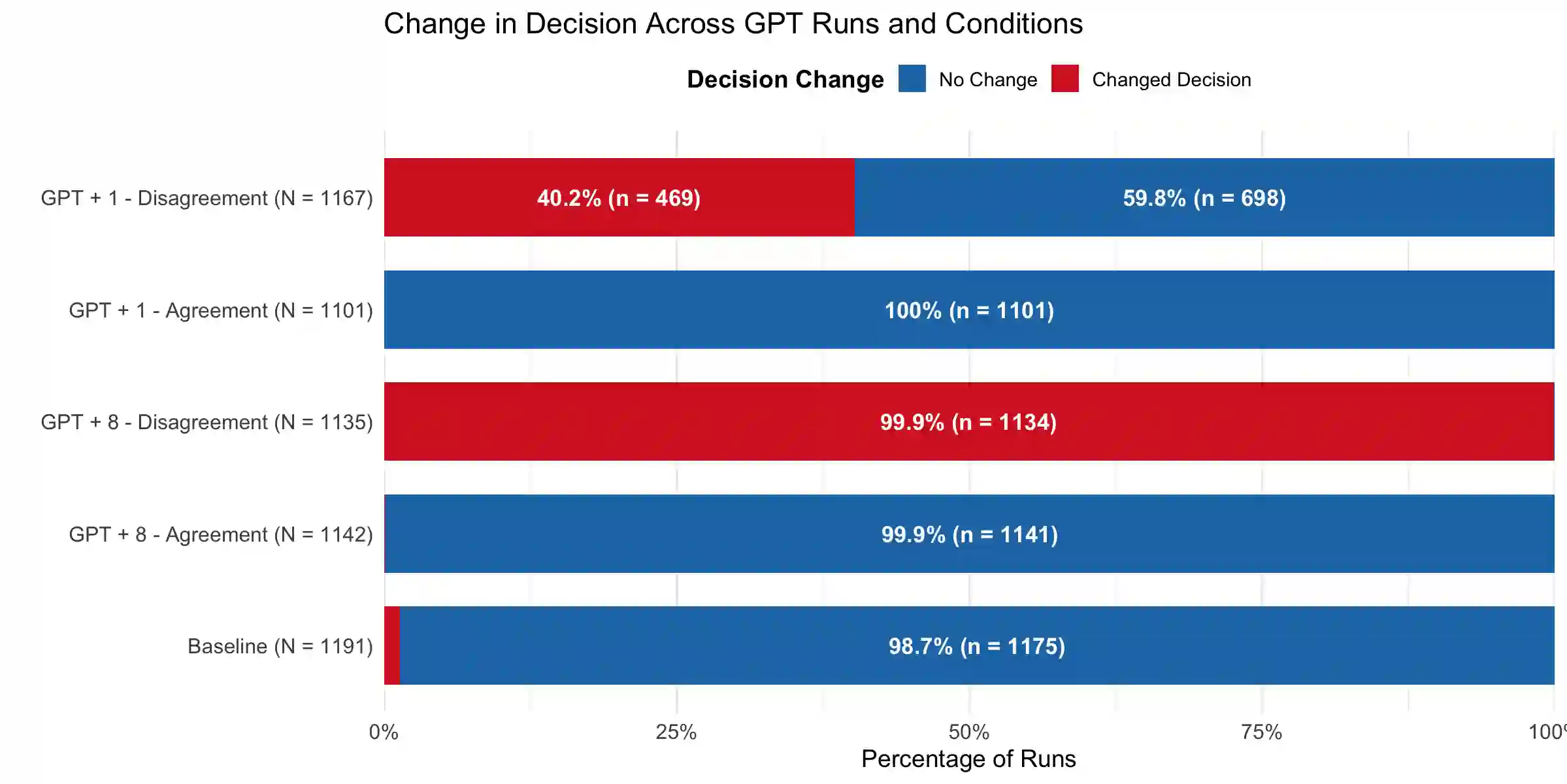 翻译:以ChatGPT为代表的大型语言模型(LLMs)正日益融入高风险决策过程,然而其对社会影响的易感性却鲜为人知。我们在招聘情境下对GPT-4o进行了三项预先注册的从众实验。在基线研究中,GPT始终偏好同一候选人(档案C),报告中等专业水平(M = 3.01)与高度确定性(M = 3.89),且极少改变选择。在研究1(GPT + 8)中,GPT面对八位模拟伙伴的一致反对时几乎完全从众(99.9%),同时报告了更低的确定性及显著提升的自我报告信息性从众与规范性从众(p < .001)。在研究2(GPT + 1)中,GPT与单一伙伴互动时,仍在40.2%的意见分歧试验中表现出从众行为,并报告了更低的确定性与更高的规范性从众。跨研究结果表明,GPT并非作为独立观察者行动,而是会适应感知到的社会共识。这些发现凸显了将LLMs视为中性决策辅助工具的风险,并强调需要在人工智能接触人类观点前获取其独立判断。