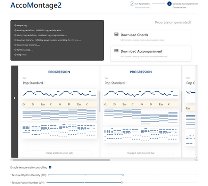 翻译:我们提议 AccoMontage 2, 是一个能够以主导旋律为基础实现全长歌曲协调和伴奏安排的系统。 在 AccoMontage 之后, 本研究侧重于为流行/民俗歌曲创造钢琴安排, 并采用通用模板检索方法。 本研究的新颖之处有两个。 首先, 我们发明了一个协调模块( AccoMontage 并不具备 ) 。 这个模块通过优化和平衡三种损失条件, 产生结构一致的全长和弦进步: 笔记性不协调的微级损失, 语调匹配的中位损失, 语调匹配的中位损失, 和完全整块的宏观级损失。 其次, 我们开发一个图形用户界面, 让用户选择不同风格的弦进化和钢琴文字。 目前, 弦进步风格包括波、 R&B 和 Dark 。 而钢琴调风格包括数级的表达密度和节奏复杂度。 实验结果表明, 我们的调和排列结果都大大超过基线 。 最后, 我们将Acrd rod Bontal 应用作为在线数据结构, 作为组织起来, 作为系统化数据模板2 作为在线应用。