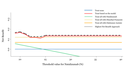 翻译:决定曲线分析可用于确定个人化的治疗惠益模型是否会导致更好的临床决策。决定曲线分析方法被描述用来使用单一RCT的数据估算治疗惠益。我们的主要目标是将决定曲线分析方法扩展至有几种治疗选项的假设情况,并用网络元分析(NMA)综合分析(NMA)综合分析(NAMA)分析其影响的证据。我们用从NMA合成的研究中合成的证据来描述预测模型的净效益所需的步骤。我们展示了如何将个人化的适应性与一尺寸全方位的治疗决策战略进行比较,例如“无治疗”或“对所有患者进行特定治疗”战略。我们的主要目的是将决定曲线分析方法扩展至一个合理的临界值范围,以揭示最临床有用的战略。我们用NMA预测模型来估计预测模型重新拉动多度硬度。在Nathalizumab、Dimet Fummer Fumarate、Glatiramer Acetate和Phero之间可以作出选择。我们用这个模型来说明整个决策优势分析的扩展战略,或者用一个更精确的临界值分析方法来评估。在一次评估其重要的诊断模型中,可以用来评估其重要的诊断值,在一次分析中可以用来进行更好的组合分析。在一次诊断分析中,在一次评估之前,在一次分析中可以用来进行一个精确的模型中可以用来评估。