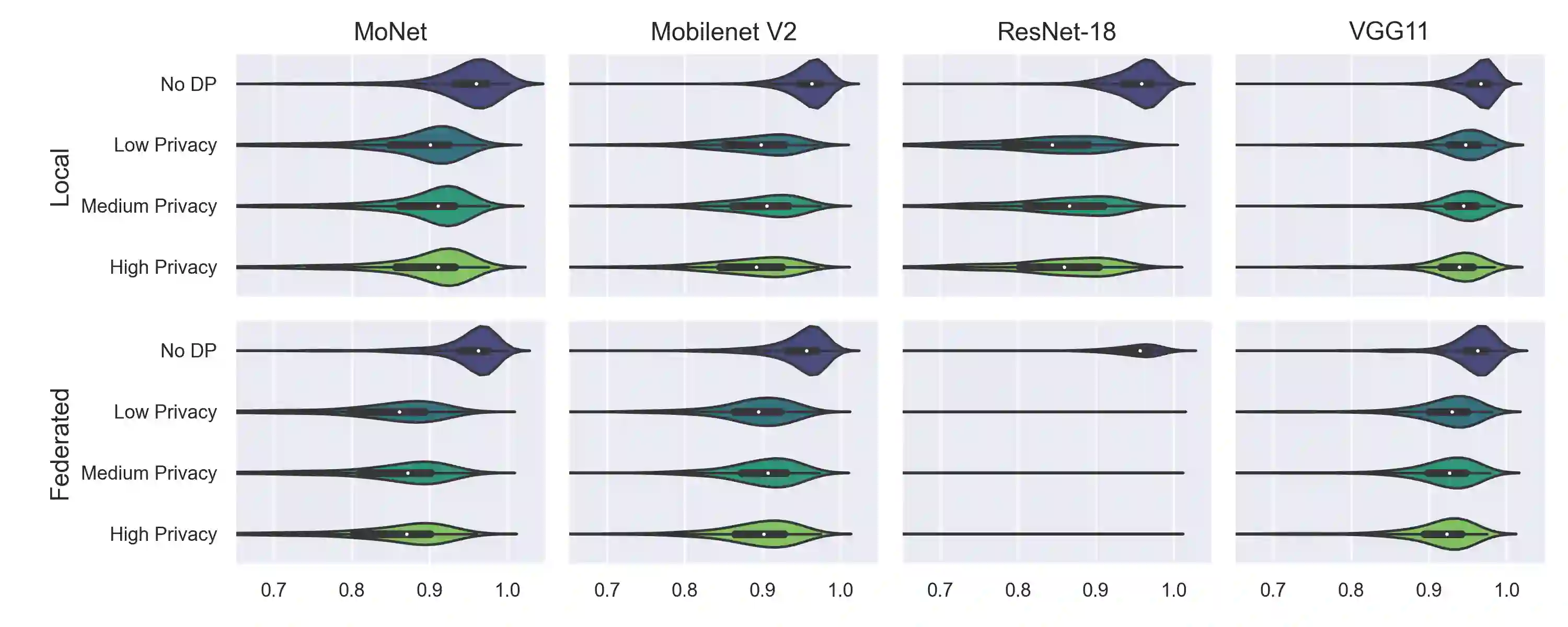 翻译:最近的举措表明,在FL培训的分化模式能够取得与当地培训的模式相似的性能。然而,FL并不是一种完全保护隐私的技术,而以隐私为中心的攻击可以披露保密病人数据。因此,在多机构环境下,对临床应用,如差异隐私(DP)等增强隐私的技术(PTs)是一种要求。在医学成像中将PT应用于FL以及隐私保障和模型效用之间的取舍、对培训绩效的影响以及最终模型是否容易受到攻击等都还没有得到彻底的调查。我们在这里展示了在计算成像中的基于差异的梯度的FL任务中首次应用了差异性梯度的FL。我们发现,在强大的隐私保障下高分化性能是有可能的,有可接受的培训时间罚款。我们进一步展示了第一个成功的基于梯度的反向攻击模型在语义分解模型上的应用,并表明DP的应用防止其分解敏感图像特征。