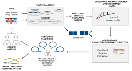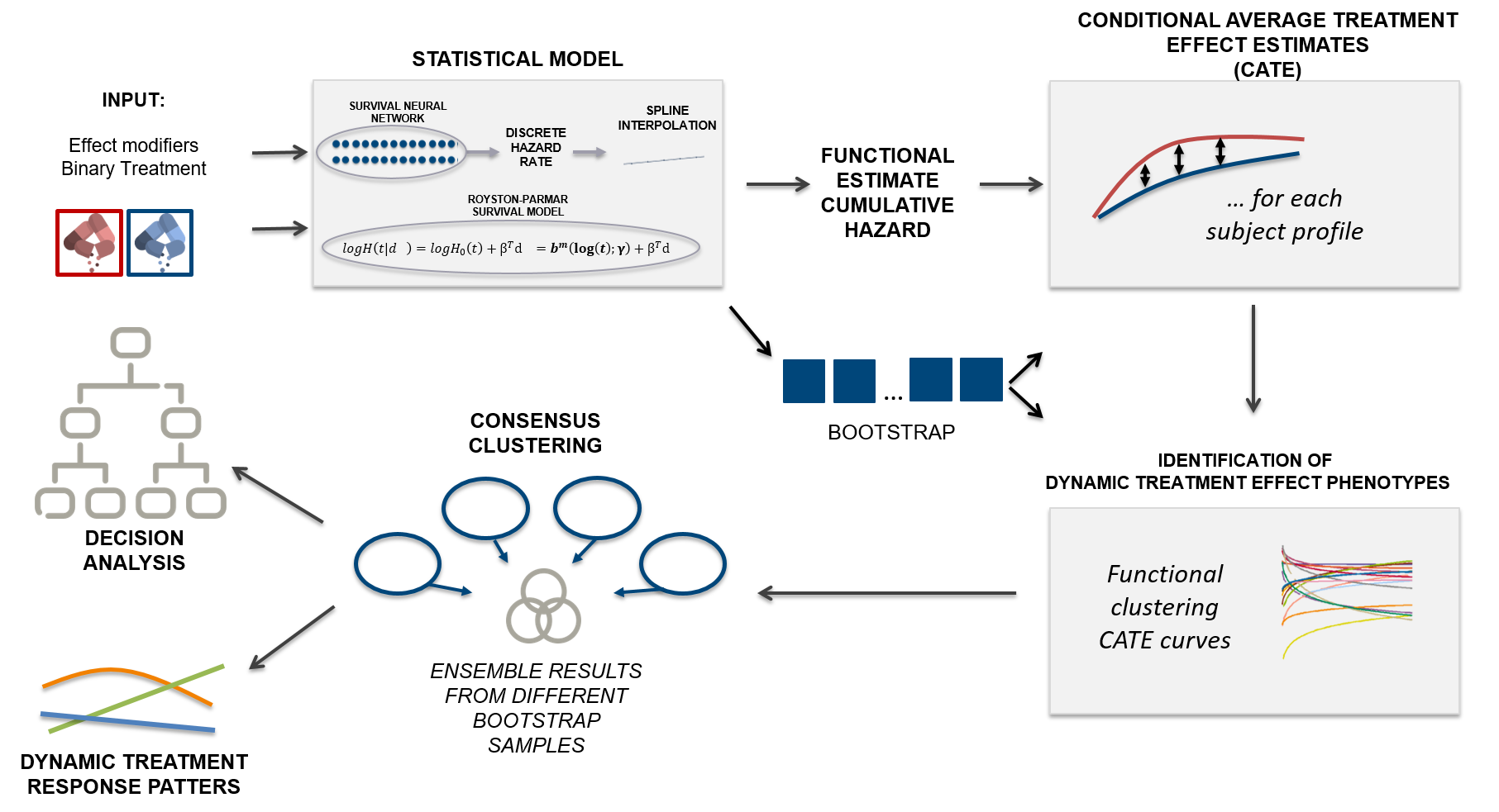 In recent years, research interest in personalised treatments has been growing. However, treatment effect heterogeneity and possibly time-varying treatment effects are still often overlooked in clinical studies. Statistical tools are needed for the identification of treatment response patterns, taking into account that treatment response is not constant over time. We aim to provide an innovative method to obtain dynamic treatment effect phenotypes on a time-to-event outcome, conditioned on a set of relevant effect modifiers. The proposed method does not require the assumption of proportional hazards for the treatment effect, which is rarely realistic. We propose a spline-based survival neural network, inspired by the Royston-Parmar survival model, to estimate time-varying conditional treatment effects. We then exploit the functional nature of the resulting estimates to apply a functional clustering of the treatment effect curves in order to identify different patterns of treatment effects. The application that motivated this work is the discontinuation of treatment with Mineralocorticoid receptor Antagonists (MRAs) in patients with heart failure, where there is no clear evidence as to which patients it is the safest choice to discontinue treatment and, conversely, when it leads to a higher risk of adverse events. The data come from an electronic health record database. A simulation study was performed to assess the performance of the spline-based neural network and the stability of the treatment response phenotyping procedure. We provide a novel method to inform individualized medical decisions by characterising subject-specific treatment responses over time.
