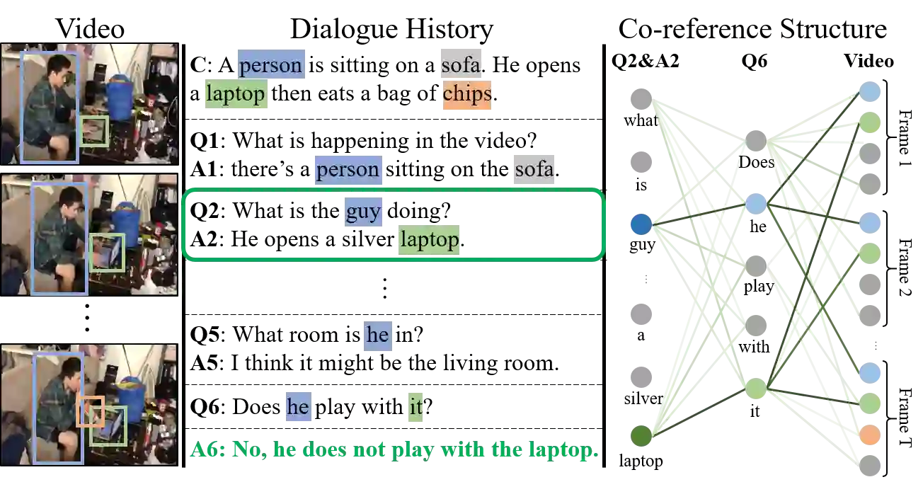 A video-grounded dialogue system referred to as the Structured Co-reference Graph Attention (SCGA) is presented for decoding the answer sequence to a question regarding a given video while keeping track of the dialogue context. Although recent efforts have made great strides in improving the quality of the response, performance is still far from satisfactory. The two main challenging issues are as follows: (1) how to deduce co-reference among multiple modalities and (2) how to reason on the rich underlying semantic structure of video with complex spatial and temporal dynamics. To this end, SCGA is based on (1) Structured Co-reference Resolver that performs dereferencing via building a structured graph over multiple modalities, (2) Spatio-temporal Video Reasoner that captures local-to-global dynamics of video via gradually neighboring graph attention. SCGA makes use of pointer network to dynamically replicate parts of the question for decoding the answer sequence. The validity of the proposed SCGA is demonstrated on AVSD@DSTC7 and AVSD@DSTC8 datasets, a challenging video-grounded dialogue benchmarks, and TVQA dataset, a large-scale videoQA benchmark. Our empirical results show that SCGA outperforms other state-of-the-art dialogue systems on both benchmarks, while extensive ablation study and qualitative analysis reveal performance gain and improved interpretability.