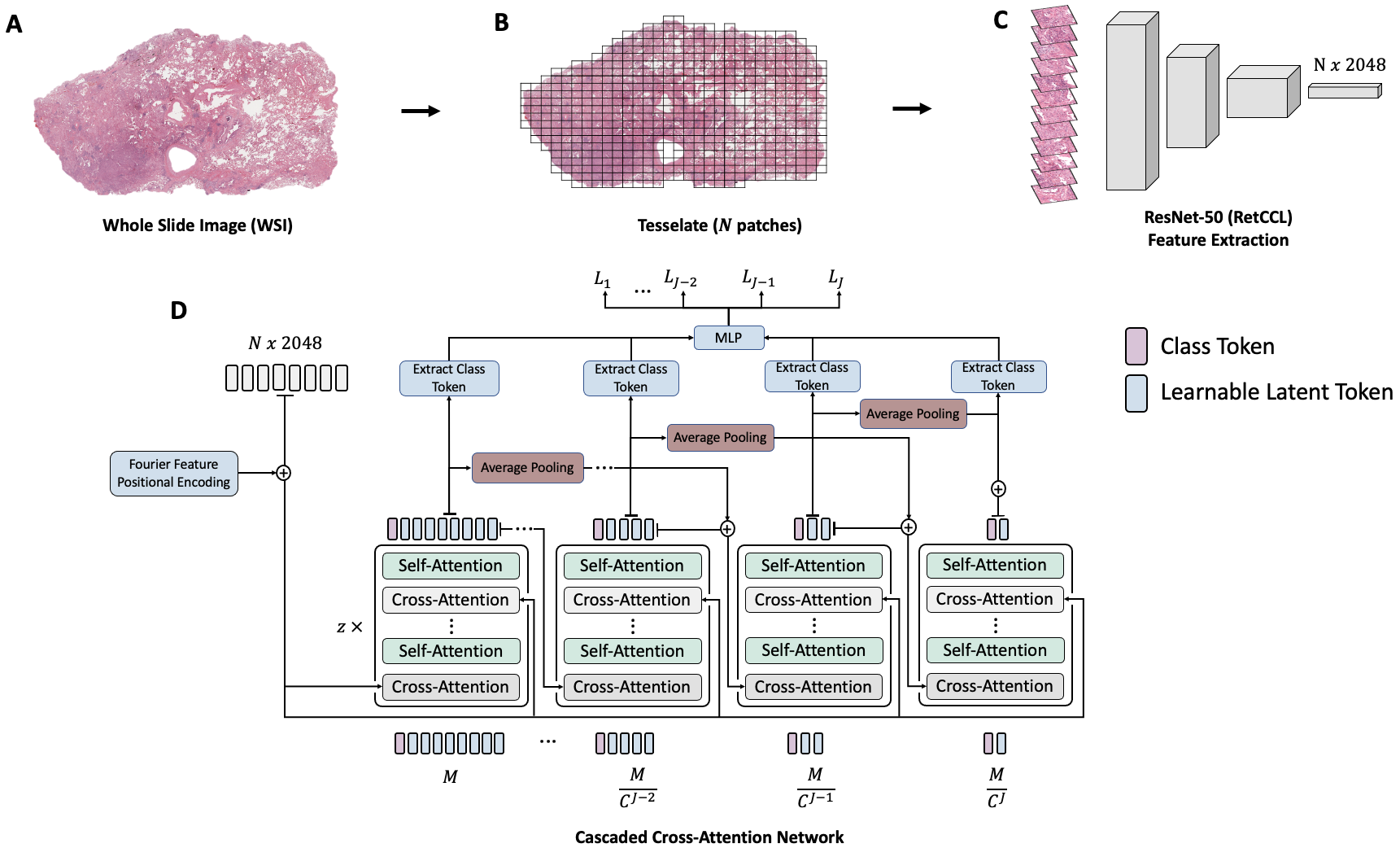 Whole-Slide Imaging allows for the capturing and digitization of high-resolution images of histological specimen. An automated analysis of such images using deep learning models is therefore of high demand. The transformer architecture has been proposed as a possible candidate for effectively leveraging the high-resolution information. Here, the whole-slide image is partitioned into smaller image patches and feature tokens are extracted from these image patches. However, while the conventional transformer allows for a simultaneous processing of a large set of input tokens, the computational demand scales quadratically with the number of input tokens and thus quadratically with the number of image patches. To address this problem we propose a novel cascaded cross-attention network (CCAN) based on the cross-attention mechanism that scales linearly with the number of extracted patches. Our experiments demonstrate that this architecture is at least on-par with and even outperforms other attention-based state-of-the-art methods on two public datasets: On the use-case of lung cancer (TCGA NSCLC) our model reaches a mean area under the receiver operating characteristic (AUC) of 0.970 $\pm$ 0.008 and on renal cancer (TCGA RCC) reaches a mean AUC of 0.985 $\pm$ 0.004. Furthermore, we show that our proposed model is efficient in low-data regimes, making it a promising approach for analyzing whole-slide images in resource-limited settings. To foster research in this direction, we make our code publicly available on GitHub: XXX.