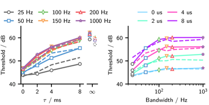 翻译:噪音的间歇阶段与目标音调改善检测阈值之间的差异。 最大遮盖释放量是用于检测丁酸噪声中的抗发音( S$\pi$) (N0) 。 几项研究显示,由于对N0S$\pi$复合体应用了间延,这一效益逐渐下降。 这一下降量是由于噪音的跨度一致性降低所致。 在此, 我们报告在将噪声遮盖时的500赫兹音调的阈值为5至1 000赫兹。 在将噪声带宽度从100至50赫兹和25赫兹时,8毫兹时的遮盖释放量将增加,预期随着带宽的减少而提高时间一致性。 对于100至1000赫兹的带宽,没有观察到任何显著差异,而且这些噪音的检测阈值的延迟依赖度也完全由典型的音调调调的听器过滤器带所设定的时间一致性所设定。 一种最小的硬度二进制模型建议基于跨度阶段差异波动,而不假定延迟线。