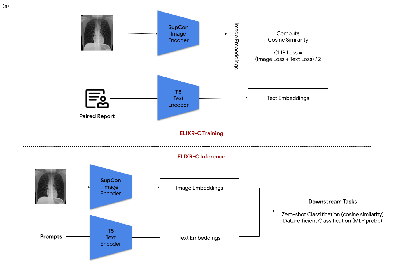 Our approach, which we call Embeddings for Language/Image-aligned X-Rays, or ELIXR, leverages a language-aligned image encoder combined or grafted onto a fixed LLM, PaLM 2, to perform a broad range of tasks. We train this lightweight adapter architecture using images paired with corresponding free-text radiology reports from the MIMIC-CXR dataset. ELIXR achieved state-of-the-art performance on zero-shot chest X-ray (CXR) classification (mean AUC of 0.850 across 13 findings), data-efficient CXR classification (mean AUCs of 0.893 and 0.898 across five findings (atelectasis, cardiomegaly, consolidation, pleural effusion, and pulmonary edema) for 1% (~2,200 images) and 10% (~22,000 images) training data), and semantic search (0.76 normalized discounted cumulative gain (NDCG) across nineteen queries, including perfect retrieval on twelve of them). Compared to existing data-efficient methods including supervised contrastive learning (SupCon), ELIXR required two orders of magnitude less data to reach similar performance. ELIXR also showed promise on CXR vision-language tasks, demonstrating overall accuracies of 58.7% and 62.5% on visual question answering and report quality assurance tasks, respectively. These results suggest that ELIXR is a robust and versatile approach to CXR AI.