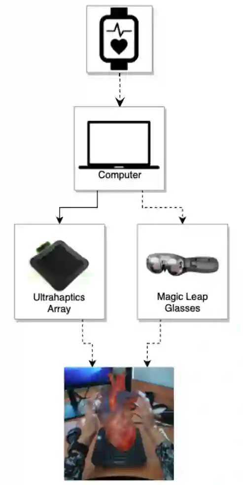 翻译:我们推出一个原型演示器, 将三种技术、 混杂的现实头顶显示器、 可磨损的生物传感器、 和中空临时投影仪结合起来, 以生物光谱提供互动的触摸体验。 这个原型的用户能够看到、 触摸和感受一个心脏的全息图, 其跳动速度和他们自己的同步。 演示使用一个Ultraphatic 装置、 一个魔术精液一个混合真实耳机和一个苹果观察器, 用来测量磨损器的心跳, 所有同步和网络化的心脏速率, 从而让手腕带的更新动态改变机能反馈和跳动心脏动速度, 从而创造更个性化的经历 。