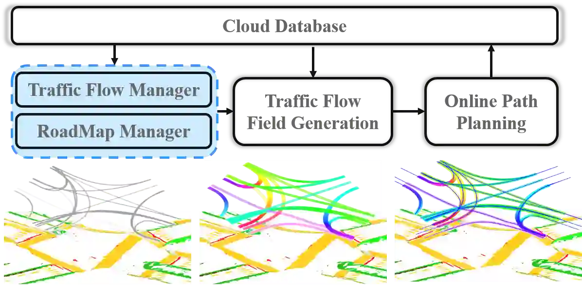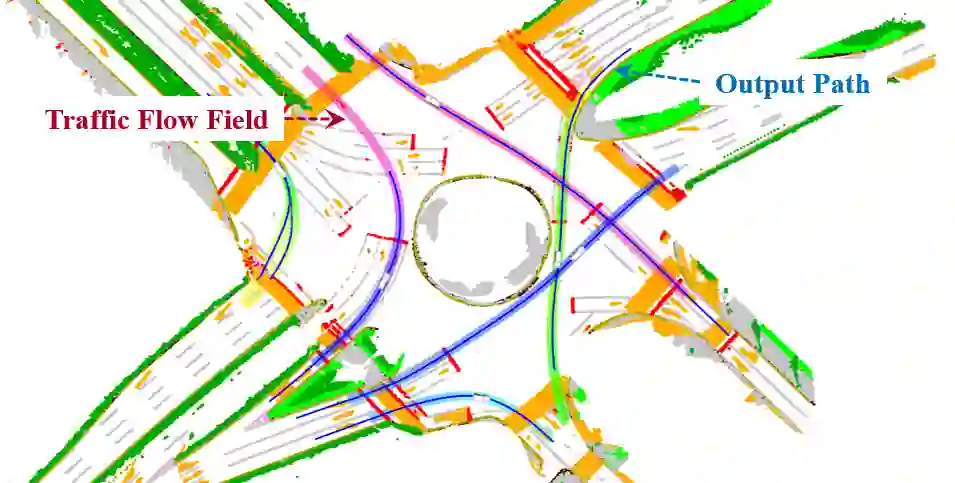 There is extensive literature on perceiving road structures by fusing various sensor inputs such as lidar point clouds and camera images using deep neural nets. Leveraging the latest advance of neural architects (such as transformers) and bird-eye-view (BEV) representation, the road cognition accuracy keeps improving. However, how to cognize the ``road'' for automated vehicles where there is no well-defined ``roads'' remains an open problem. For example, how to find paths inside intersections without HD maps is hard since there is neither an explicit definition for ``roads'' nor explicit features such as lane markings. The idea of this paper comes from a proverb: it becomes a way when people walk on it. Although there are no ``roads'' from sensor readings, there are ``roads'' from tracks of other vehicles. In this paper, we propose FlowMap, a path generation framework for automated vehicles based on traffic flows. FlowMap is built by extending our previous work RoadMap, a light-weight semantic map, with an additional traffic flow layer. A path generation algorithm on traffic flow fields (TFFs) is proposed to generate human-like paths. The proposed framework is validated using real-world driving data and is amenable to generating paths for super complicated intersections without using HD maps.