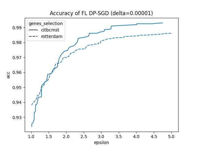 Since 2014, the NIH funded iDASH (integrating Data for Analysis, Anonymization, SHaring) National Center for Biomedical Computing has hosted yearly competitions on the topic of private computing for genomic data. For one track of the 2020 iteration of this competition, participants were challenged to produce an approach to federated learning (FL) training of genomic cancer prediction models using differential privacy (DP), with submissions ranked according to held-out test accuracy for a given set of DP budgets. More precisely, in this track, we are tasked with training a supervised model for the prediction of breast cancer occurrence from genomic data split between two virtual centers while ensuring data privacy with respect to model transfer via DP. In this article, we present our 3rd place submission to this competition. During the competition, we encountered two main challenges discussed in this article: i) ensuring correctness of the privacy budget evaluation and ii) achieving an acceptable trade-off between prediction performance and privacy budget.