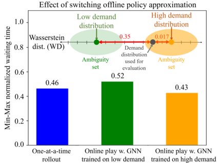 翻译:我们提出了一个学习框架,生成用于城市地图上服务随机出现请求的自主车队的路由/取货策略。我们专注于以下策略:1)引起车辆之间的协调,从而减少等待请求的时间;2)具有非悖论性,考虑先前可能出现的未来请求;3)可以适应基础需求分布的变化。特别是,我们有兴趣的策略是适应城市环境中实际需求情况的波动,例如高峰时段与非高峰时段。我们通过组合以下方式实现了这一点:(i)一种在线游戏算法,以提高离线训练策略的性能,(ii)一种离线近似方案,以适应基础需求模型的变化。特别是,我们通过使用 Wasserstein模糊集的q-有效半径量化有效区域,实现了对我们学习的策略适应不同需求分布的功能。我们提出了一种机制,在当前需求超出原始有效区域时切换最初训练的离线近似。在这种情况下,我们建议使用一个离线体系结构,该离线体系结构是在与当前需求更接近的历史需求模型上进行训练的。我们使用旧金山的实际出租车请求学习路由和取货策略,这些请求在高峰和非高峰时段之间具有高变化性,展示了我们的方法能够适应实际需求分布的波动。我们的数值结果表明,我们的方法优于基于其他滚动强化学习方案以及运筹学中其他古典方法。