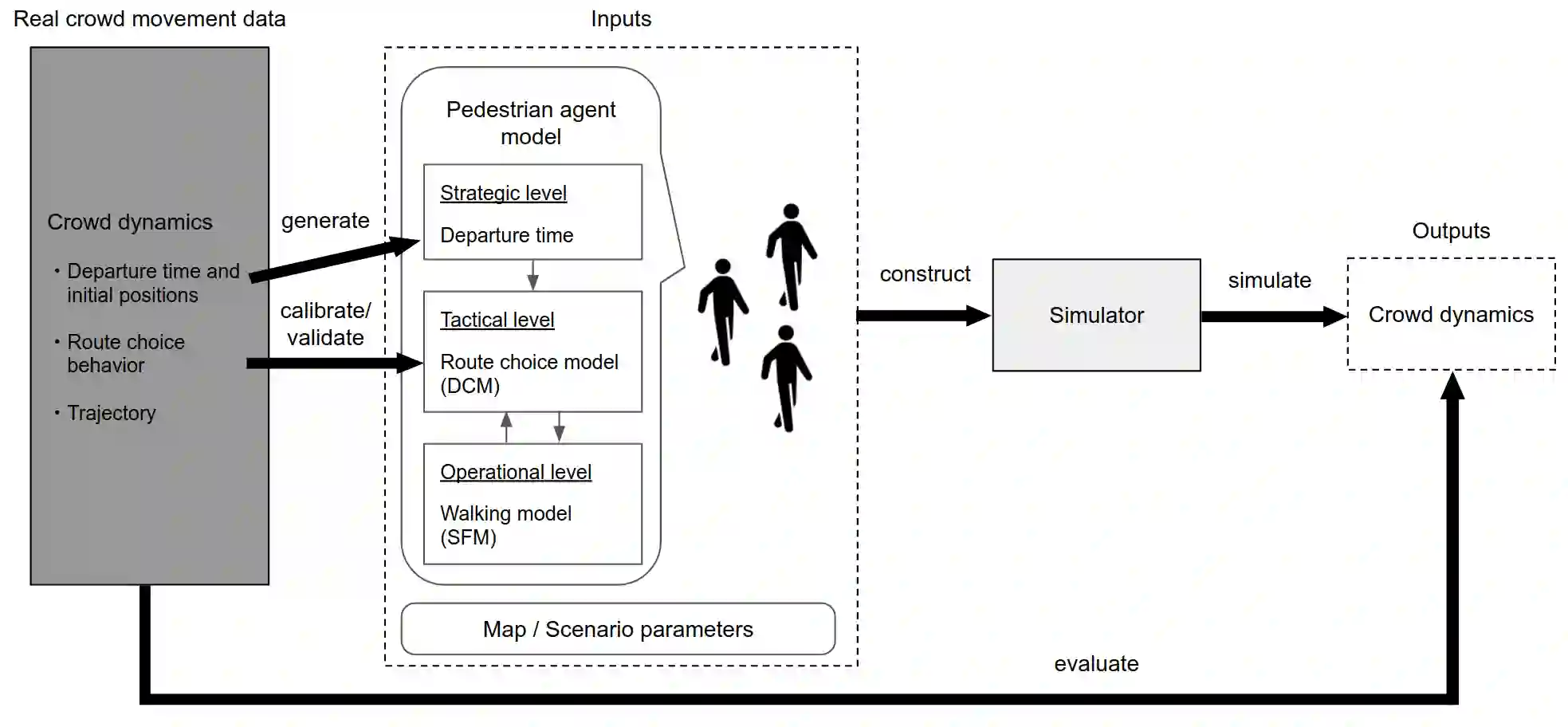 翻译:以数学模型来表达人群移动的模拟和模拟方法正在广泛和积极地研究,以了解人群移动和解决人群事故。关于人群建模的现有文献仅侧重于步行行为的决策。然而,选择路线的决策是一个更高层次的决定,也应该建模,以构建更实用的模拟。此外,使用真实数据对包含路线选择模型的人群模拟进行复制评价是不够的。因此,我们推广并提议了一个人群模拟框架,其中包括实际人群移动测量、路由选择模型估计和人群模拟器的构建。我们用混杂选择模型作为路线选择模型,用社会力量模型作为行走模型。在实验中,我们测量了在剧院的疏散演习和消防活动中的人群移动,并证明包含路线选择模型的人群模拟可以更准确地复制真正的大规模人群运动。</s>
