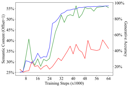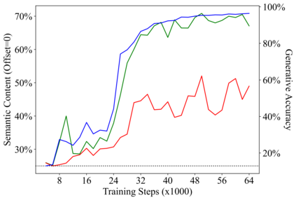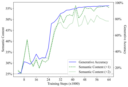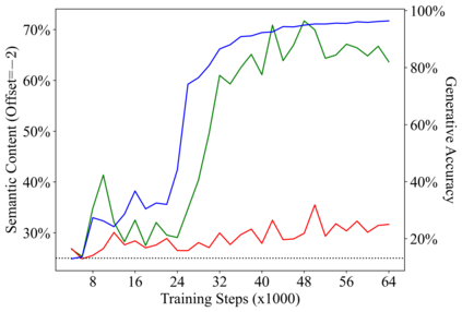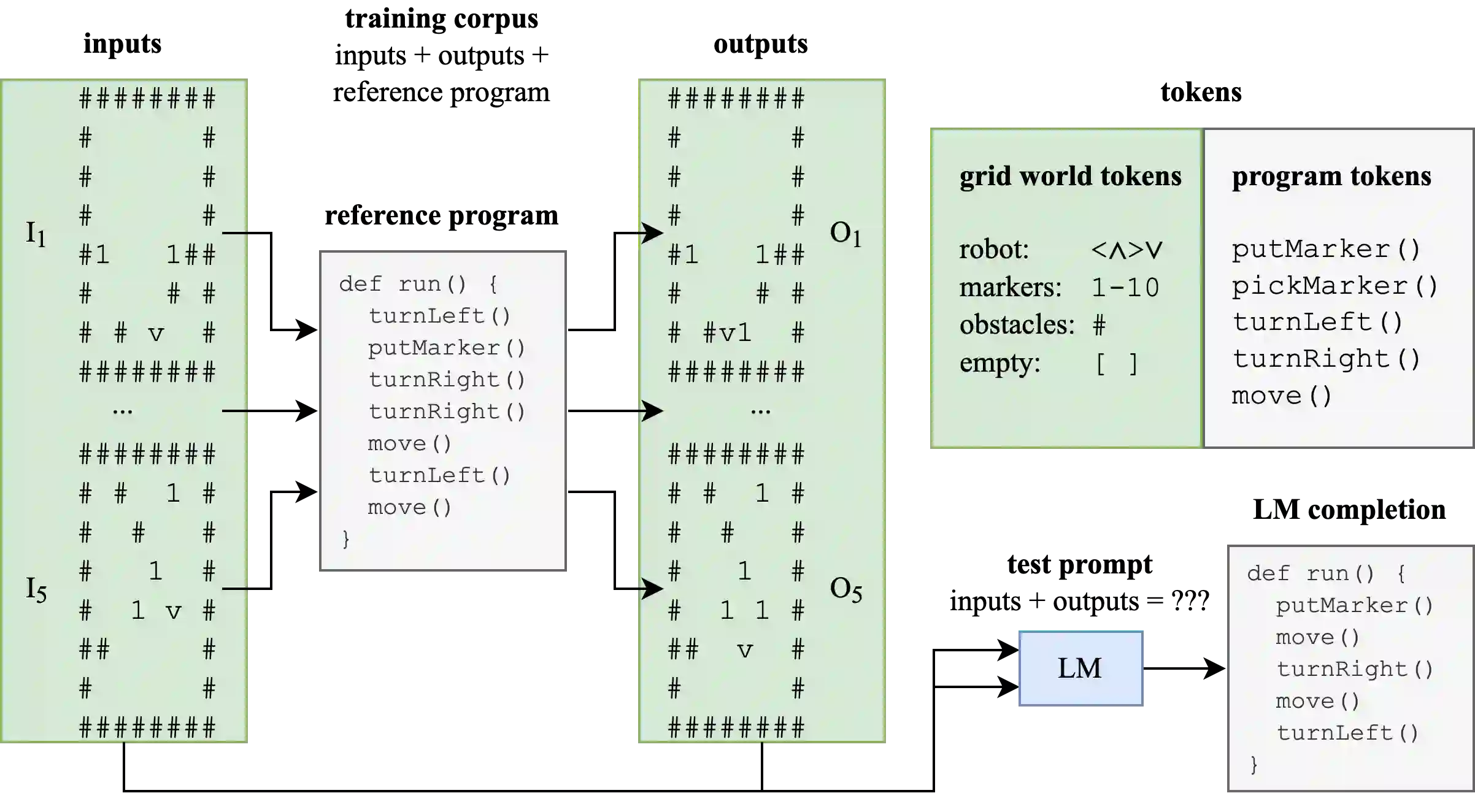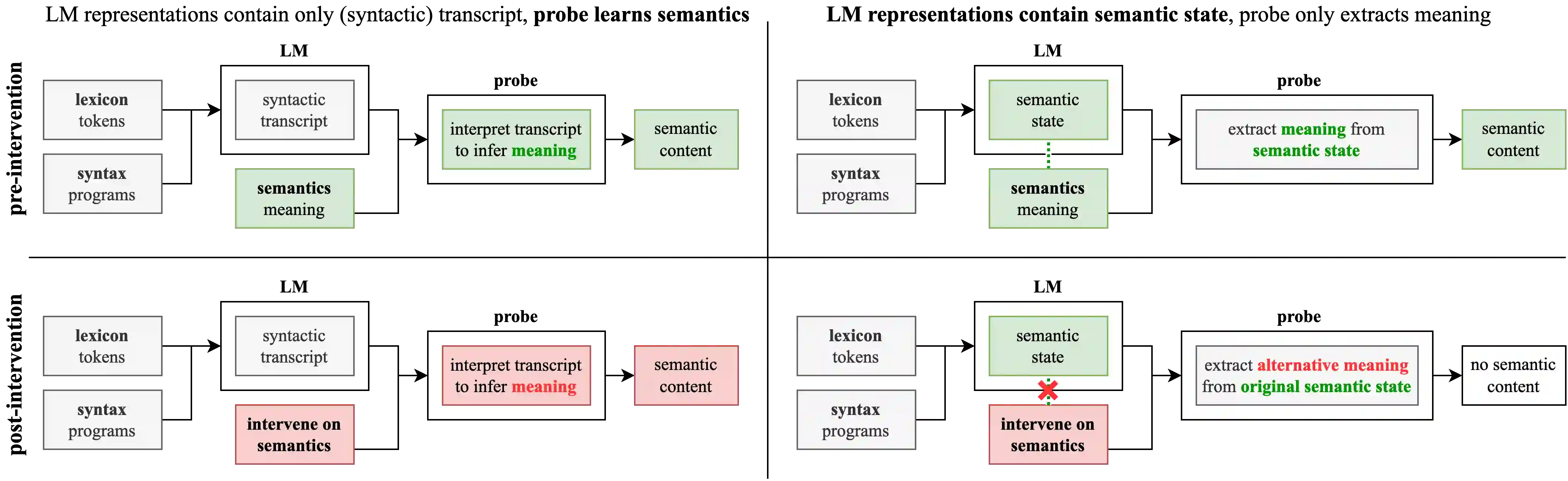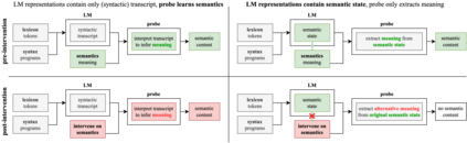 We present evidence that language models can learn meaning despite being trained only to perform next token prediction on text, specifically a corpus of programs. Each program is preceded by a specification in the form of (textual) input-output examples. Working with programs enables us to precisely define concepts relevant to meaning in language (e.g., correctness and semantics), making program synthesis well-suited as an intermediate testbed for characterizing the presence (or absence) of meaning in language models. We first train a Transformer model on the corpus of programs, then probe the trained model's hidden states as it completes a program given a specification. Despite providing no inductive bias toward learning the semantics of the language, we find that a linear probe is able to extract abstractions of both current and future program states from the model states. Moreover, there is a strong, statistically significant correlation between the accuracy of the probe and the model's ability to generate a program that implements the specification. To evaluate whether the semantics are represented in the model states rather than learned by the probe, we design a novel experimental procedure that intervenes on the semantics of the language while preserving the lexicon and syntax. We also demonstrate that the model learns to generate correct programs that are, on average, shorter than those in the training set, which is evidence that language model outputs may differ from the training distribution in semantically meaningful ways. In summary, this paper does not propose any new techniques for training language models, but develops an experimental framework for and provides insights into the acquisition and representation of (formal) meaning in language models.