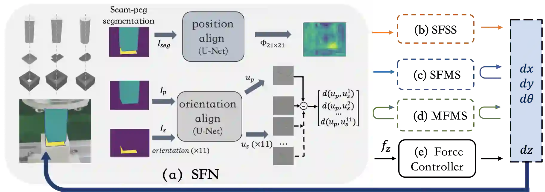In the peg insertion task, human pays attention to the seam between the peg and the hole and tries to fill it continuously with visual feedback. By imitating the human behavior, we design architectures with position and orientation estimators based on the seam representation for pose alignment, which proves to be general to the unseen peg geometries. By putting the estimators into the closed-loop control with reinforcement learning, we further achieve a higher or comparable success rate, efficiency, and robustness compared with the baseline methods. The policy is trained totally in simulation without any manual intervention. To achieve sim-to-real, a learnable segmentation module with automatic data collecting and labeling can be easily trained to decouple the perception and the policy, which helps the model trained in simulation quickly adapt to the real world with negligible effort. Results are presented in simulation and on a physical robot. Code, videos, and supplemental material are available at https://github.com/xieliang555/SFN.git
