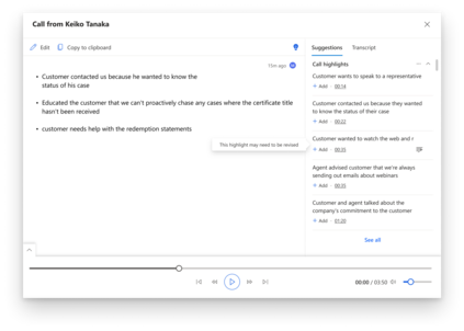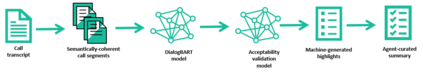 Summarizing sales calls is a routine task performed manually by salespeople. We present a production system which combines generative models fine-tuned for customer-agent setting, with a human-in-the-loop user experience for an interactive summary curation process. We address challenging aspects of dialogue summarization task in a real-world setting including long input dialogues, content validation, lack of labeled data and quality evaluation. We show how GPT-3 can be leveraged as an offline data labeler to handle training data scarcity and accommodate privacy constraints in an industrial setting. Experiments show significant improvements by our models in tackling the summarization and content validation tasks on public datasets.
