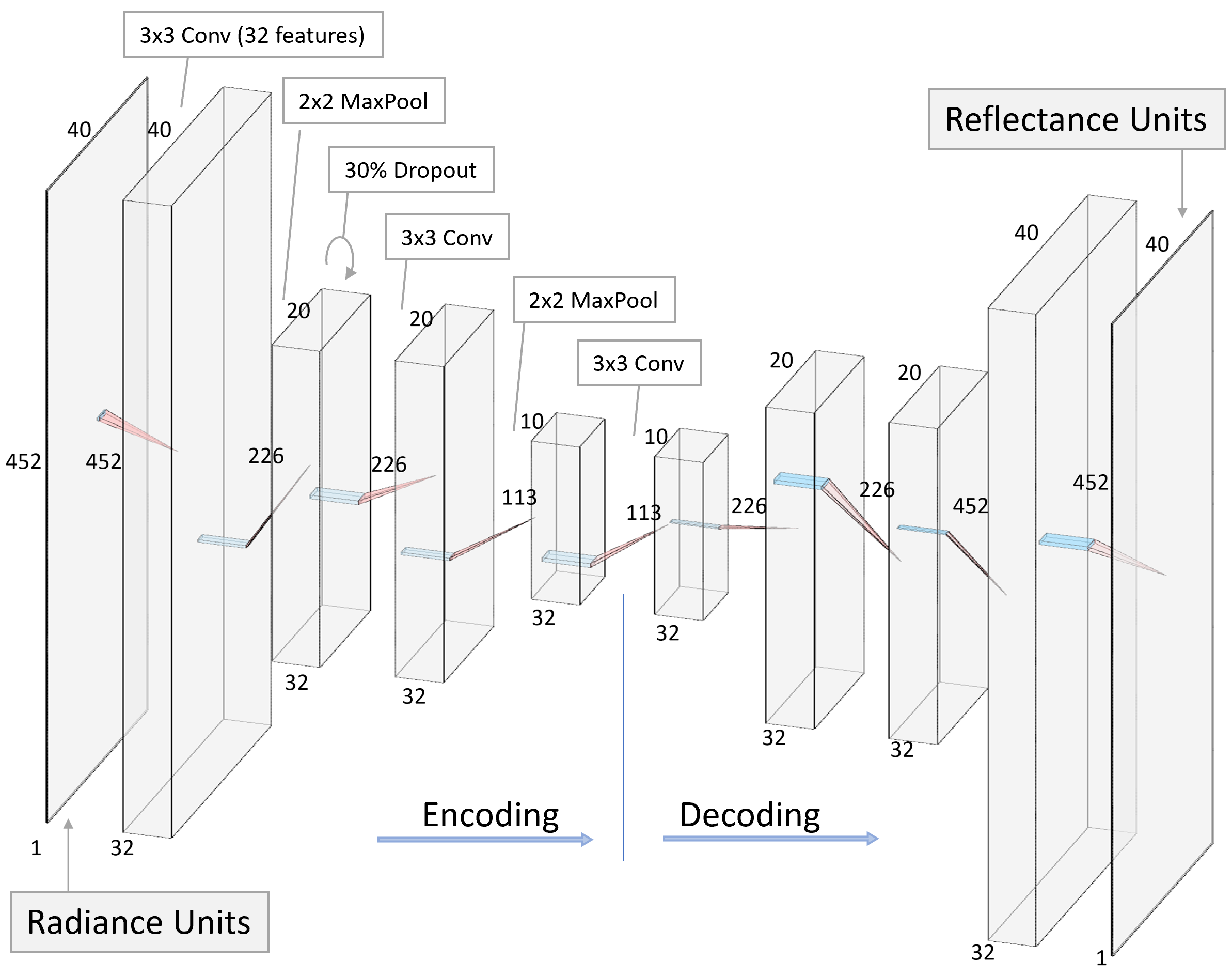 As electro-optical energy from the sun propagates through the atmosphere it is affected by radiative transfer effects including absorption, emission, and scattering. Modeling these affects is essential for scientific remote sensing measurements of the earth and atmosphere. For example, hyperspectral imagery is a form of digital imagery collected with many, often hundreds, of wavelengths of light in pixel. The amount of light measured at the sensor is the result of emitted sunlight, atmospheric radiative transfer, and the reflectance off the materials on the ground, all of which vary per wavelength resulting from multiple physical phenomena. Therefore measurements of the ground spectra or atmospheric constituents requires separating these different contributions per wavelength. In this paper, we create an autoencoder similar to denoising autoencoders treating the atmospheric affects as 'noise' and ground reflectance as truth per spectrum. We generate hundreds of thousands of training samples by taking random samples of spectra from laboratory measurements and adding atmospheric affects using physics-based modelling via MODTRAN (http://modtran.spectral.com/modtran\_home) by varying atmospheric inputs. This process ideally could create an autoencoder that would separate atmospheric effects and ground reflectance in hyperspectral imagery, a process called atmospheric compensation which is difficult and time-consuming requiring a combination of heuristic approximations, estimates of physical quantities, and physical modelling. While the accuracy of our method is not as good as other methods in the field, this an important first step in applying the growing field of deep learning of physical principles to atmospheric compensation in hyperspectral imagery and remote sensing.