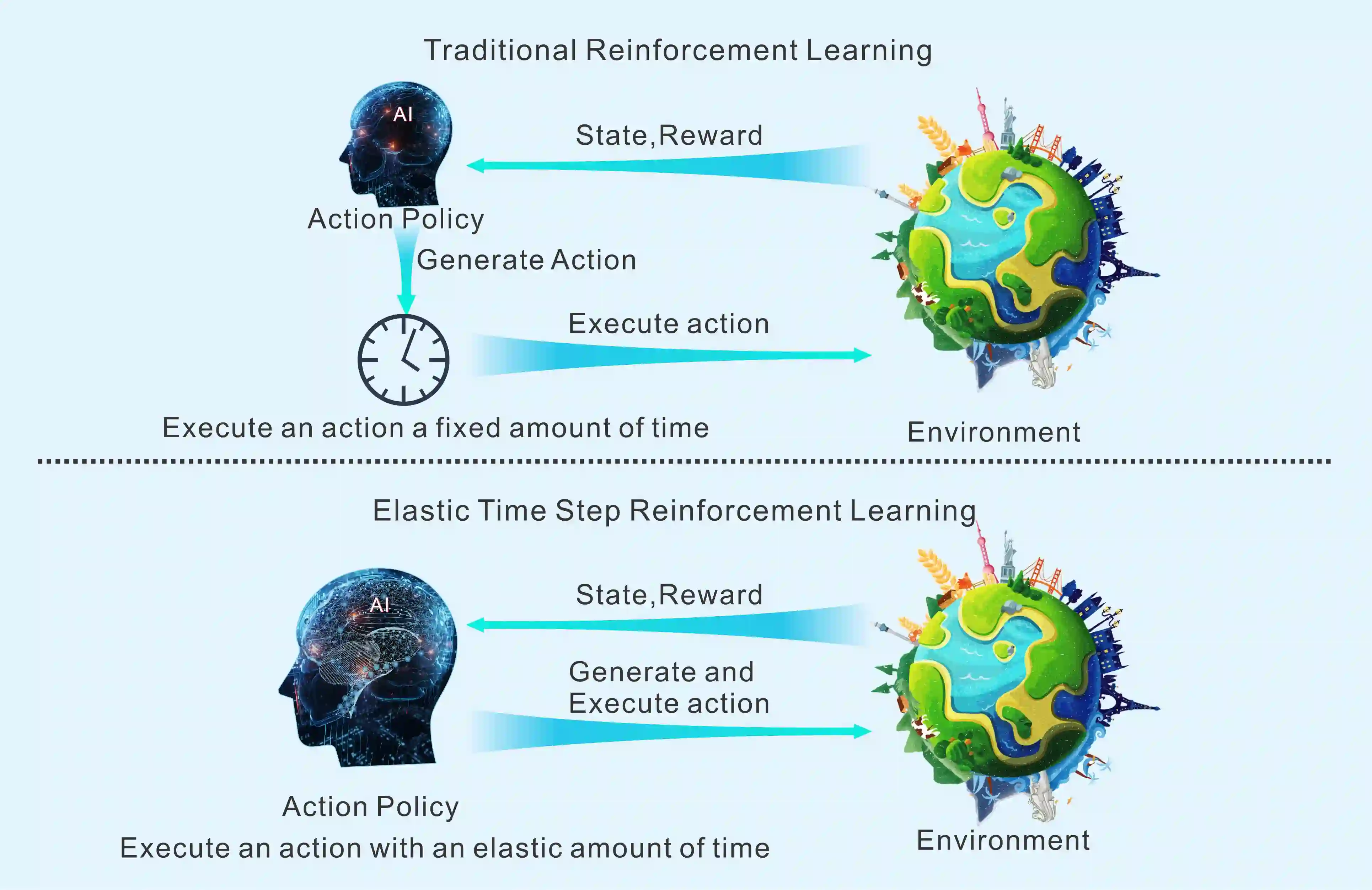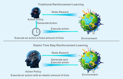Deploying controllers trained with Reinforcement Learning (RL) on real robots can be challenging: RL relies on agents' policies being modeled as Markov Decision Processes (MDPs), which assume an inherently discrete passage of time. The use of MDPs results in that nearly all RL-based control systems employ a fixed-rate control strategy with a period (or time step) typically chosen based on the developer's experience or specific characteristics of the application environment. Unfortunately, the system should be controlled at the highest, worst-case frequency to ensure stability, which can demand significant computational and energy resources and hinder the deployability of the controller on onboard hardware. Adhering to the principles of reactive programming, we surmise that applying control actions only when necessary enables the use of simpler hardware and helps reduce energy consumption. We challenge the fixed frequency assumption by proposing a variant of RL with variable control rate. In this approach, the policy decides the action the agent should take as well as the duration of the time step associated with that action. In our new setting, we expand Soft Actor-Critic (SAC) to compute the optimal policy with a variable control rate, introducing the Soft Elastic Actor-Critic (SEAC) algorithm. We show the efficacy of SEAC through a proof-of-concept simulation driving an agent with Newtonian kinematics. Our experiments show higher average returns, shorter task completion times, and reduced computational resources when compared to fixed rate policies.