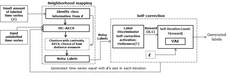 Time-series generated by end-users, edge devices, and different wearables are mostly unlabelled. We propose a method to auto-generate labels of un-labelled time-series, exploiting very few representative labelled time-series. Our method is based on representation learning using Auto Encoded Compact Sequence (AECS) with a choice of best distance measure. It performs self-correction in iterations, by learning latent structure, as well as synthetically boosting representative time-series using Variational-Auto-Encoder (VAE) to improve the quality of labels. We have experimented with UCR and UCI archives, public real-world univariate, multivariate time-series taken from different application domains. Experimental results demonstrate that the proposed method is very close to the performance achieved by fully supervised classification. The proposed method not only produces close to benchmark results but outperforms the benchmark performance in some cases.