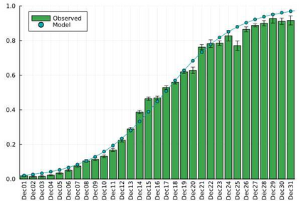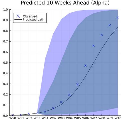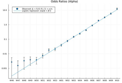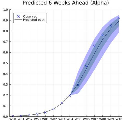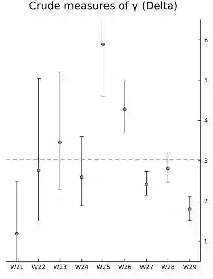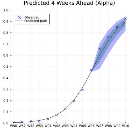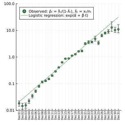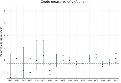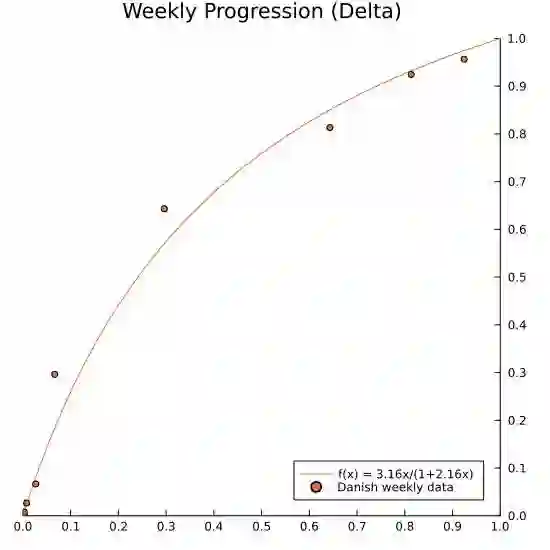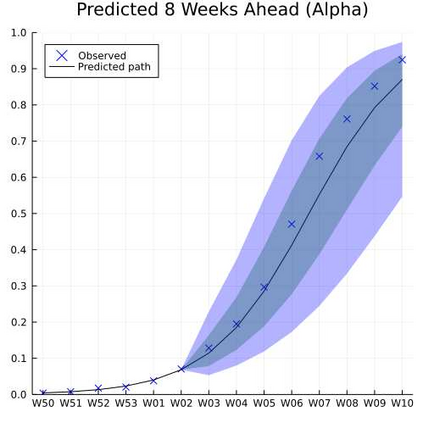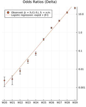 翻译:我们提出一个简单的动态模型,用于估计两种病毒变异的相对传染性。最大可能性估计和推论容易使抽样期间的病例总数变化不定,并且可以作为一种后勤倒退来表示。我们将模型应用于丹麦SARS-COV-2变异数据。我们估计阿尔法和德尔塔的复制数比祖传变异的复制数大1.51倍[CI95%:1.50,1.53]和3.28 [CI95%:3.01,3.58]。在大多数接种疫苗的人口中,我们估计Omicron的传染性比德尔塔高出3.15倍[CI95%:2.83,3.50]。预测新出现的病毒变异的比例是直接向前的,我们继续显示如何在没有当代测序结果的情况下能够估计新变异的有效繁殖数。这对实时评估大流行病状况很有用,因为我们用阿尔法变异的推断有效繁殖数来进行实验。