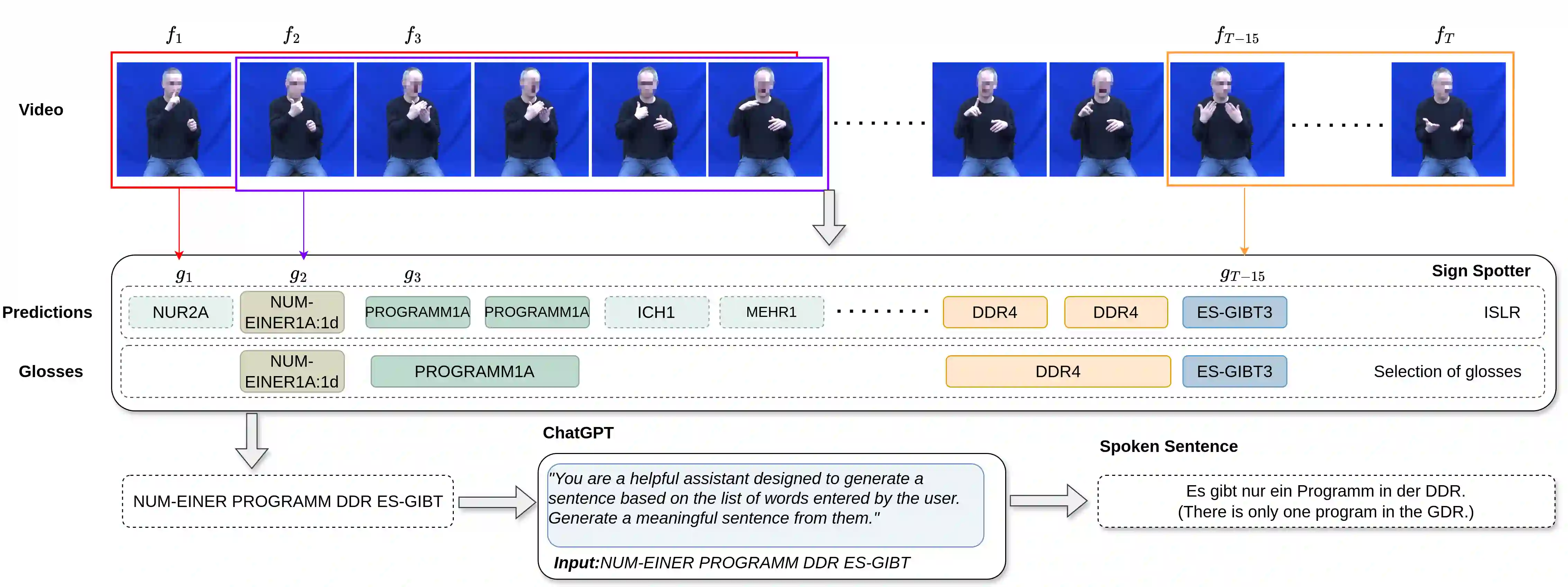 Sign Language Translation (SLT) is a challenging task that aims to generate spoken language sentences from sign language videos. In this paper, we introduce a hybrid SLT approach, Spotter+GPT, that utilizes a sign spotter and a pretrained large language model to improve SLT performance. Our method builds upon the strengths of both components. The videos are first processed by the spotter, which is trained on a linguistic sign language dataset, to identify individual signs. These spotted signs are then passed to the powerful language model, which transforms them into coherent and contextually appropriate spoken language sentences.