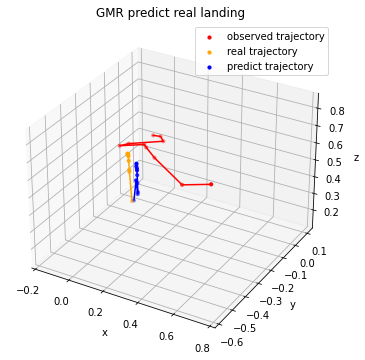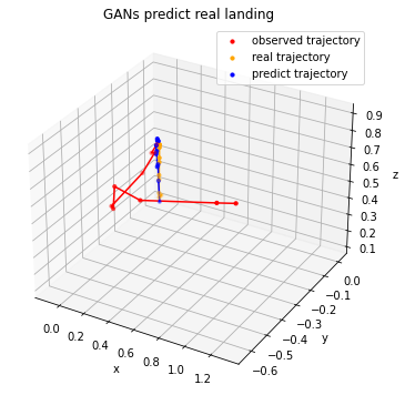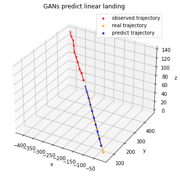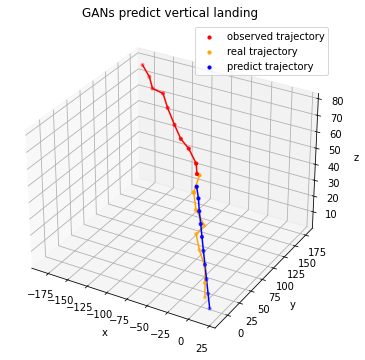 Models for trajectory prediction are an essential component of many advanced air mobility studies. These models help aircraft detect conflict and plan avoidance maneuvers, which is especially important in Unmanned Aircraft systems (UAS) landing management due to the congested airspace near vertiports. In this paper, we propose a landing trajectory prediction model for UAS based on Generative Adversarial Network (GAN). The GAN is a prestigious neural network that has been developed for many years. In previous research, GAN has achieved many state-of-the-art results in many generation tasks. The GAN consists of one neural network generator and a neural network discriminator. Because of the learning capacity of the neural networks, the generator is capable to understand the features of the sample trajectory. The generator takes the previous trajectory as input and outputs some random status of a flight. According to the results of the experiences, the proposed model can output more accurate predictions than the baseline method(GMR) in various datasets. To evaluate the proposed model, we also create a real UAV landing dataset that includes more than 2600 trajectories of drone control manually by real pilots.