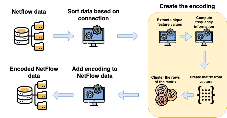 NetFlow data is a well-known network log format used by many network analysts and researchers. The advantages of using this format compared to pcap are that it contains fewer data, is less privacy intrusive, and is easier to collect and process. However, having less data does mean that this format might not be able to capture important network behaviour as all information is summarised into statistics. Much research aims to overcome this disadvantage through the use of machine learning, for instance, to detect attacks within a network. Many approaches can be used to pre-process the NetFlow data before it is used to train the machine learning algorithms. However, many of these approaches simply apply existing methods to the data, not considering the specific properties of network data. We argue that for data originating from software systems, such as NetFlow or software logs, similarities in frequency and contexts of feature values are more important than similarities in the value itself. In this work, we, therefore, propose an encoding algorithm that directly takes the frequency and the context of the feature values into account when the data is being processed. Different types of network behaviours can be clustered using this encoding, thus aiding the process of detecting anomalies within the network. From windows of these clusters obtained from monitoring a clean system, we learn state machine behavioural models for anomaly detection. These models are very well-suited to modelling the cyclic and repetitive patterns present in NetFlow data. We evaluate our encoding on a new dataset that we created for detecting problems in Kubernetes clusters and on two well-known public NetFlow datasets. The obtained performance results of the state machine models are comparable to existing works that use many more features and require both clean and infected data as training input.