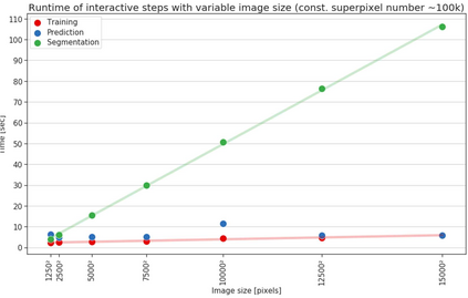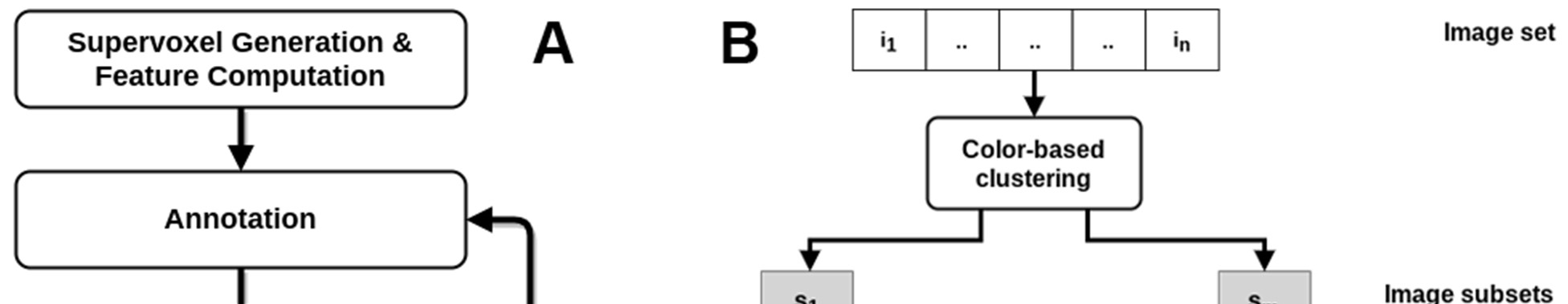 We present a novel approach that combines machine learning based interactive image segmentation using supervoxels with a clustering method for the automated identification of similarly colored images in large data sets which enables a guided reuse of classifiers. Our approach solves the problem of significant color variability prevalent and often unavoidable in biological and medical images which typically leads to deteriorated segmentation and quantification accuracy thereby greatly reducing the necessary training effort. This increase in efficiency facilitates the quantification of much larger numbers of images thereby enabling interactive image analysis for recent new technological advances in high-throughput imaging. The presented methods are applicable for almost any image type and represent a useful tool for image analysis tasks in general.