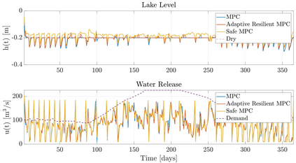 In recent years, SCADA (Supervisory Control and Data Acquisition) systems have increasingly become the target of cyber attacks. SCADAs are no longer isolated, as web-based applications expose strategic infrastructures to the outside world connection. In a cyber-warfare context, we propose a Model Predictive Control (MPC) architecture with adaptive resilience, capable of guaranteeing control performance in normal operating conditions and driving towards resilience against DoS (controller-actuator) attacks when needed. Since the attackers' goal is typically to maximize the system damage, we assume they solve an adversarial optimal control problem. An adaptive resilience factor is then designed as a function of the intensity function of a Hawkes process, a point process model estimating the occurrence of random events in time, trained on a moving window to estimate the return time of the next attack. We demonstrate the resulting MPC strategy's effectiveness in 2 attack scenarios on a real system with actual data, the regulated Olginate dam of Lake Como.