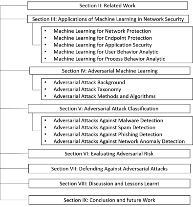 机器学习模型已经使得许多决策支持系统更快、更准确、更高效。然而,在网络安全中应用机器学习面临着比其他领域更加不成比例的对抗性攻击威胁。这是因为机器学习在网络安全领域的应用,如恶意软件检测、入侵检测和垃圾邮件过滤本身就具有对抗性。在攻击者和防御者之间的一场所谓的“军备竞赛”中,对手不断利用专门设计的输入来探测机器学习系统,以绕过系统并诱导错误预测。在本次调查中,我们首先提供了机器学习技术、任务和深度的分类方式。我们接着介绍了网络安全应用中的机器学习分类。接下来,我们分析了针对网络安全中的机器学习的各种对抗性攻击,并引入了两种基于分类的网络安全中的对抗性攻击方法。首先,我们根据网络安全应用程序的分类方法,将针对网络安全的对抗性攻击进行分类。其次,我们将网络安全中的对抗性攻击分类成问题空间 vs 特征空间的分类模型。然后,我们分析了针对基于机器学习的网络安全应用程序的各种防御。最后,我们引入了一个对抗性风险网格图,并使用该风险网格图评估了针对网络安全中机器学习的若干现有对抗性攻击。我们还确定每种攻击分类在对抗性风险网格图中的位置。