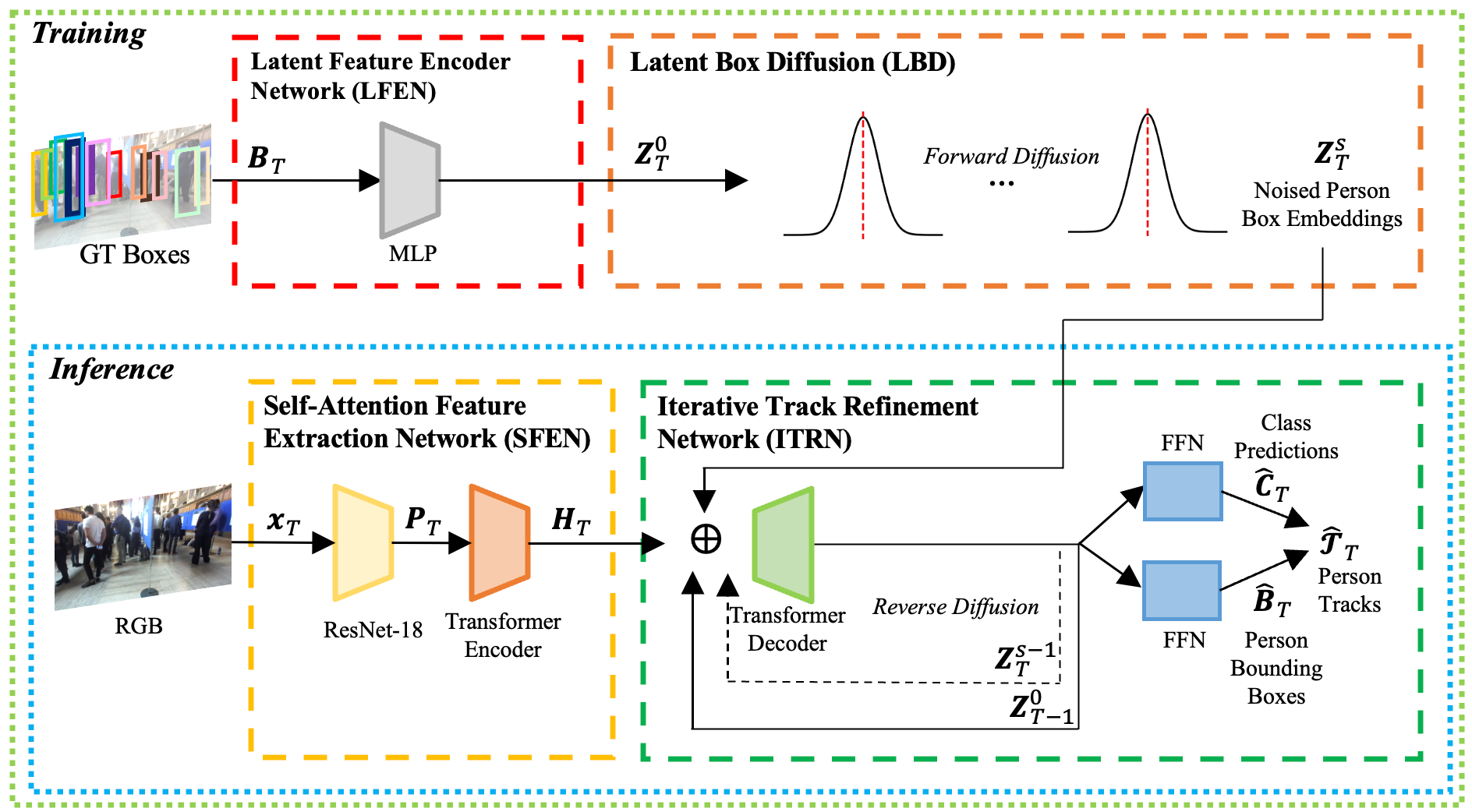 Tracking of dynamic people in cluttered and crowded human-centered environments is a challenging robotics problem due to the presence of intraclass variations including occlusions, pose deformations, and lighting variations. This paper introduces a novel deep learning architecture, using conditional latent diffusion models, the Latent Diffusion Track (LDTrack), for tracking multiple dynamic people under intraclass variations. By uniquely utilizing conditional latent diffusion models to capture temporal person embeddings, our architecture can adapt to appearance changes of people over time. We incorporated a latent feature encoder network which enables the diffusion process to operate within a high-dimensional latent space to allow for the extraction and spatial-temporal refinement of such rich features as person appearance, motion, location, identity, and contextual information. Extensive experiments demonstrate the effectiveness of LDTrack over other state-of-the-art tracking methods in cluttered and crowded human-centered environments under intraclass variations. Namely, the results show our method outperforms existing deep learning robotic people tracking methods in both tracking accuracy and tracking precision with statistical significance. Additionally, a comprehensive multi-object tracking comparison study was performed against the state-of-the-art methods in urban environments, demonstrating the generalizability of LDTrack. An ablation study was performed to validate the design choices of LDTrack.