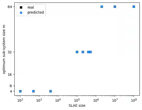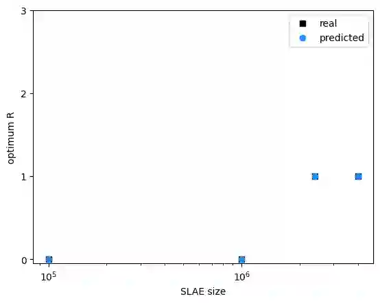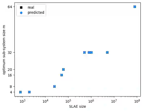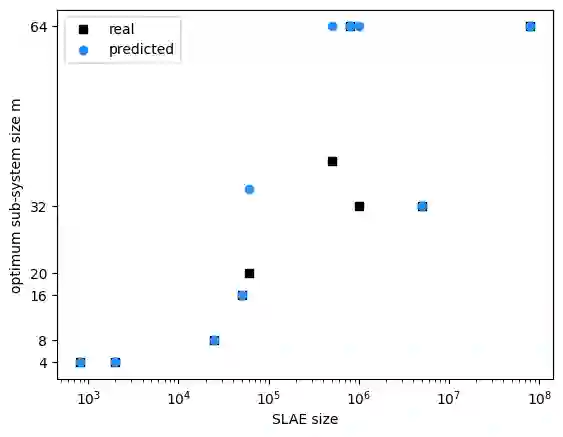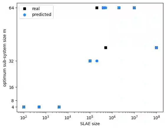 翻译:本文提出了一种基于机器学习(ML)的启发式方法,用于寻找并行划分算法CUDA实现中的最优子系统规模。针对不同规模的线性代数方程组(SLAE)进行了计算实验,并通过经验方法确定了各自的最优子系统规模。为构建子系统规模的预测模型,我们采用了k近邻(kNN)分类方法,并对结果进行了统计分析。通过比较预测值与实际数据,该算法被认定为具有可接受的优良性能。随后,该启发式方法被扩展至适用于递归并行划分算法。我们提出了一种用于确定各递归步骤最优子系统规模的算法,并构建了kNN模型以预测特定SLAE规模下的最优递归步骤数量。