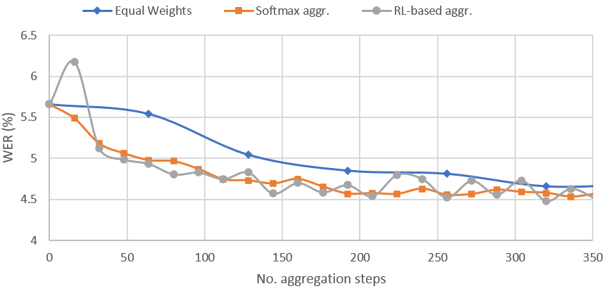 翻译:在本文中,引入了联邦学习联盟(FL)的新学习算法。拟议办法的基础是使用两步优化的加权梯度汇总,以提供一个灵活的培训管道。在此,提出了两种不同的组合方法口味,导致与其他分布式或FL培训算法(如BMUF和FedAvg)相比,趋同速度有一定的提高。此外,聚合算法作为梯度质量的正规化器发挥作用。我们调查了我们的FL算法在监督和不受监督的语音识别(SR)情景中的影响。实验验证基于三项任务进行:首先,LibriSpeech任务显示比基线结果加速7x和6%字差率降低(WERR),第二项任务基于会议调整,在强大的LAS模型上提供20%的WERR。最后,我们未受监督的管道用于谈话式的SR任务。拟议的FL系统在趋同速度和总体模型性能上都超过了基线系统。