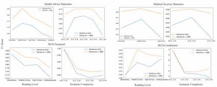User-generated texts available on the web and social platforms are often long and semantically challenging, making them difficult to annotate. Obtaining human annotation becomes increasingly difficult as problem domains become more specialized. For example, many health NLP problems require domain experts to be a part of the annotation pipeline. Thus, it is crucial that we develop low-resource NLP solutions able to work with this set of limited-data problems. In this study, we employ Abstract Meaning Representation (AMR) graphs as a means to model low-resource Health NLP tasks sourced from various online health resources and communities. AMRs are well suited to model online health texts as they can represent multi-sentence inputs, abstract away from complex terminology, and model long-distance relationships between co-referring tokens. AMRs thus improve the ability of pre-trained language models to reason about high-complexity texts. Our experiments show that we can improve performance on 6 low-resource health NLP tasks by augmenting text embeddings with semantic graph embeddings. Our approach is task agnostic and easy to merge into any standard text classification pipeline. We experimentally validate that AMRs are useful in the modeling of complex texts by analyzing performance through the lens of two textual complexity measures: the Flesch Kincaid Reading Level and Syntactic Complexity. Our error analysis shows that AMR-infused language models perform better on complex texts and generally show less predictive variance in the presence of changing complexity.
