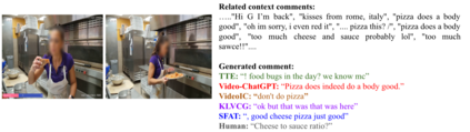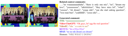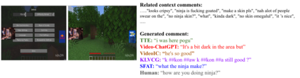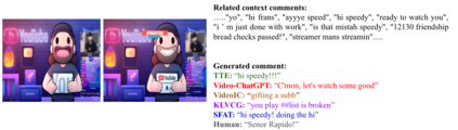 Live commenting on video streams has surged in popularity on platforms like Twitch, enhancing viewer engagement through dynamic interactions. However, automatically generating contextually appropriate comments remains a challenging and exciting task. Video streams can contain a vast amount of data and extraneous content. Existing approaches tend to overlook an important aspect of prioritizing video frames that are most relevant to ongoing viewer interactions. This prioritization is crucial for producing contextually appropriate comments. To address this gap, we introduce a novel Semantic Frame Aggregation-based Transformer (SFAT) model for live video comment generation. This method not only leverages CLIP's visual-text multimodal knowledge to generate comments but also assigns weights to video frames based on their semantic relevance to ongoing viewer conversation. It employs an efficient weighted sum of frames technique to emphasize informative frames while focusing less on irrelevant ones. Finally, our comment decoder with a cross-attention mechanism that attends to each modality ensures that the generated comment reflects contextual cues from both chats and video. Furthermore, to address the limitations of existing datasets, which predominantly focus on Chinese-language content with limited video categories, we have constructed a large scale, diverse, multimodal English video comments dataset. Extracted from Twitch, this dataset covers 11 video categories, totaling 438 hours and 3.2 million comments. We demonstrate the effectiveness of our SFAT model by comparing it to existing methods for generating comments from live video and ongoing dialogue contexts.