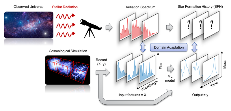 The prevalent paradigm of machine learning today is to use past observations to predict future ones. What if, however, we are interested in knowing the past given the present? This situation is indeed one that astronomers must contend with often. To understand the formation of our universe, we must derive the time evolution of the visible mass content of galaxies. However, to observe a complete star life, one would need to wait for one billion years! To overcome this difficulty, astrophysicists leverage supercomputers and evolve simulated models of galaxies till the current age of the universe, thus establishing a mapping between observed radiation and star formation histories (SFHs). Such ground-truth SFHs are lacking for actual galaxy observations, where they are usually inferred -- with often poor confidence -- from spectral energy distributions (SEDs) using Bayesian fitting methods. In this investigation, we discuss the ability of unsupervised domain adaptation to derive accurate SFHs for galaxies with simulated data as a necessary first step in developing a technique that can ultimately be applied to observational data.
