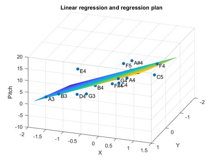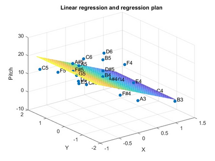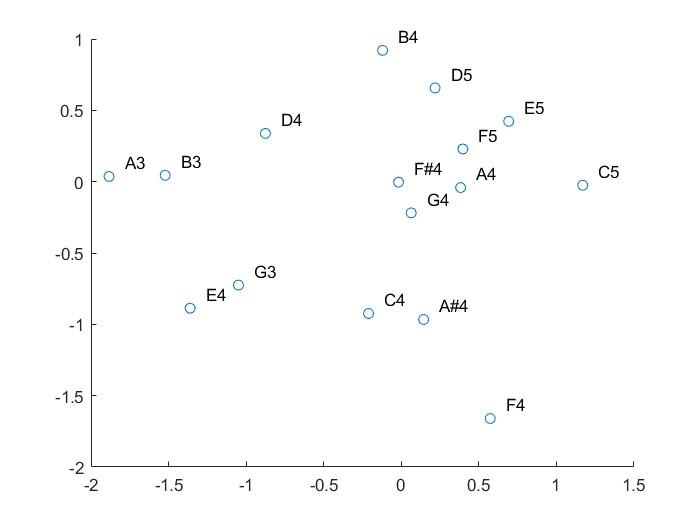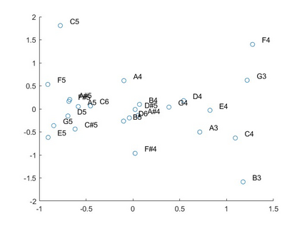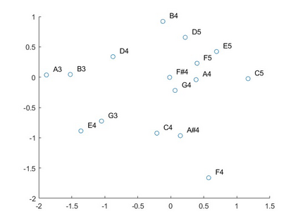 Applying the word2vec technique, commonly used in language modeling, to melodies, where notes are treated as words in sentences, enables the capture of pitch information. This study examines two datasets: 20 children's songs and an excerpt from a Bach sonata. The semantic space for defining the embeddings is of very small dimension, specifically 2. Notes are predicted based on the 2, 3 or 4 preceding notes that establish the context. A multivariate analysis of the results shows that the semantic vectors representing the notes have a multiple correlation coefficient of approximately 0.80 with their pitches.