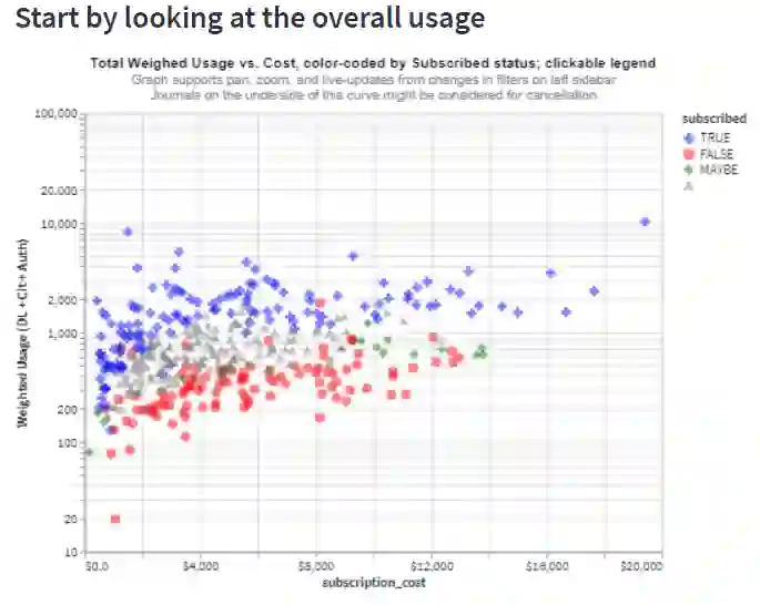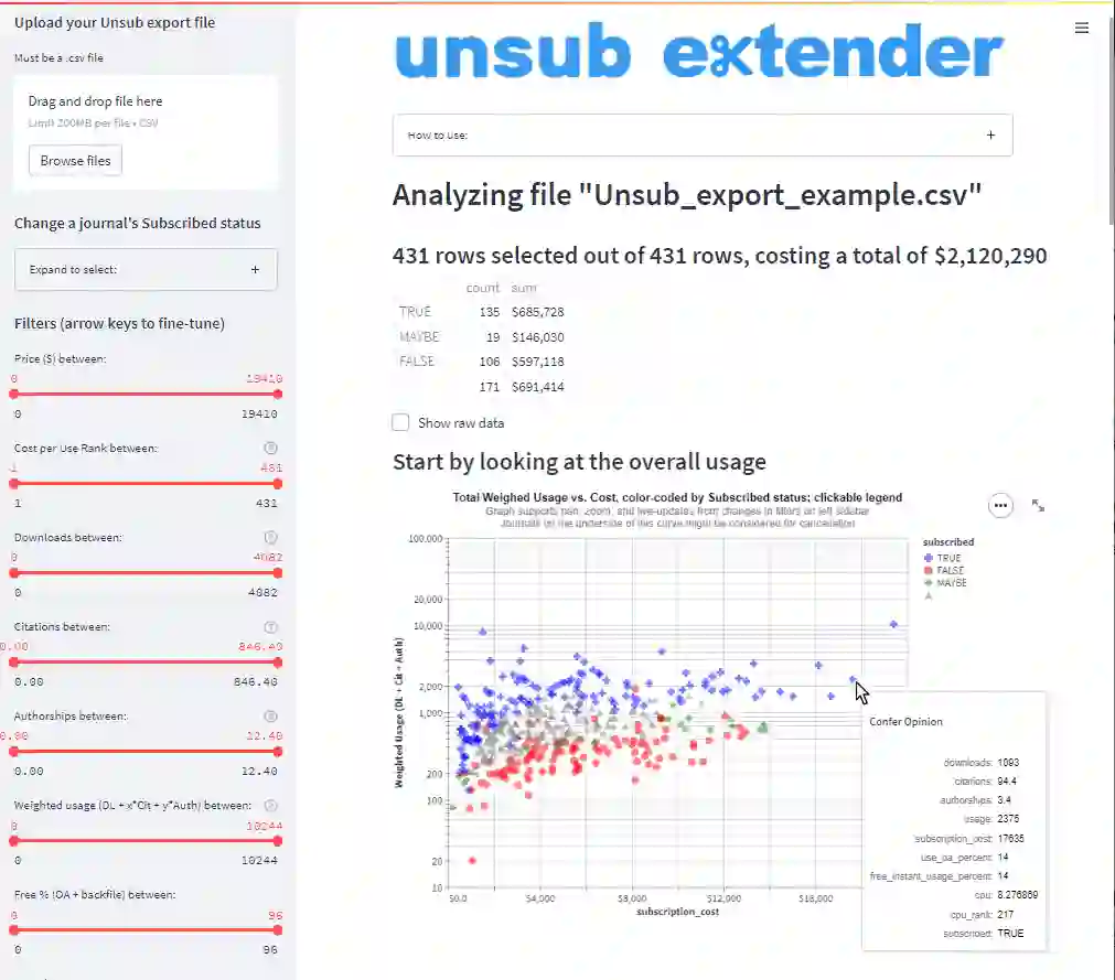 翻译:此篇文章引入了 Unsub 扩展器, 这是一个帮助图书馆分析其 Usub 数据导出文档的免费工具 。 Uunsub 是一个收集开发仪表板, 收集并预报日记级使用量的度量, 以便向学术图书馆提供比传统成本每用更深的测量数据。 Uunsub 提供更丰富、更细化的数据, 分析其订阅量, 但并不包含一个方便地视觉化它所提供的复杂和相互关联的数据点的方法 。 Uunsub 扩展器( https://unsubextender.lib. iastate.edu) 是一个免费 Python 的网络应用程序, 它使用 Unsuble Export 菜单, 并自动将创建互动图和可视化的图解创建。 工具中包含用于探索的示例数据, 用户上传其特定的非子文件文件, 以快速地用实际数据来显示预设的图。 图表是互动的, 启用和支持缩放版图, 能够更精确地将数据复制到 。
