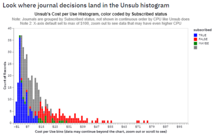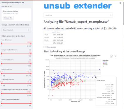 This article introduces Unsub Extender, a free tool to help libraries analyze their Unsub data export files. Unsub is a collection development dashboard that gathers and forecasts journal-level usage metrics to provide academic libraries with deeper measurements than traditional cost-per-use. Unsub gives libraries richer and more nuanced data to analyze their subscriptions, but it does not include a way to easily visualize the complex and interrelated data points it provides. Unsub Extender (https://unsubextender.lib.iastate.edu) is a free Python-based web application that takes an Unsub export file and automates the creation of interactive plots and visualizations. The tool loads with example data to explore, and users upload their specific Unsub file to quickly populate the pre-made plots with actual data. Graphs are interactive, live-updating, and support zoom, click-and-drag, and hover. Filters are specified through sliders to model scenarios and focus on areas of interest. A drop-down menu allows users to change a journal's decision status, and graphs update automatically. After evaluating journals, users can export the modified dataset to save their decisions. Unsub Extender proposes best practice in analyzing the increasingly common Unsub export file. It simplifies the analysis, eliminates duplication of effort, and enables libraries worldwide to make better, more data-driven decisions.