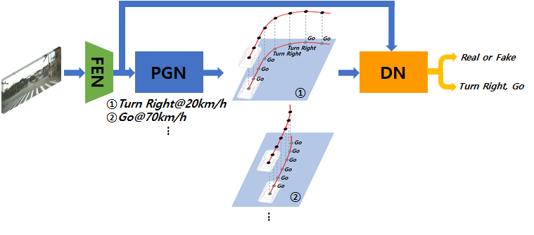 Targeting autonomous driving without High-Definition maps, we present a model capable of generating multiple plausible paths from sensory inputs for autonomous vehicles. Our generative model comprises two neural networks, Feature Extraction Network (FEN) and Path Generation Network (PGN). FEN extracts meaningful features from input scene images while PGN generates multiple paths from the features given a driving intention and speed. To make paths generated by PGN both be plausible and match the intention, we introduce a discrimination network and train it with PGN under generative adversarial networks (GANs) framework. Besides, to further increase the accuracy and diversity of the generated paths, we encourage PGN to capture intentions hidden in the positions in the paths and let the discriminator evaluate how realistic the sequential intentions are. Finally, we introduce ETRIDriving, the dataset for autonomous driving where the recorded sensory data is labeled with discrete high-level driving actions, and demonstrate the-state-of-the-art performances of the proposed model on ETRIDriving in terms of the accuracy and diversity.