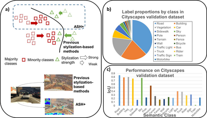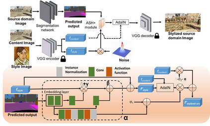 翻译:我们的目标是减少实际应用中模型训练所需的被标记的数据量,因为获取足够标记数据不切实际。因此,我们解决语义分割领域泛化的问题。最近的领域泛化方法通过使图像的颜色、风格和纹理等领域特定特征多样化来增强数据多样性。然而,过多的样式化甚至均一化的样式化会降低模型性能,尤其是在对抗极具挑战的小类像素分类时。因此,我们引入了一个模块 $ASH_{+}$,根据每个像素点的语义内容来调节样式化强度。在本文中,我们还引入了一个参数,用于平衡样式化的元素和通道上的比例,与样式化前的源领域特征在样式化后的源领域图像中的比例。这个学习的参数取代了经验确定的全局超参数,可以更精细地控制输出的样式化图像。我们进行了多次实验来验证我们提出的方法的有效性。最后,我们在公开的基准语义分割数据集(Cityscapes 和 SYNTHIA)上评估了我们的模型。定量和定性比较表明我们的方法是与最先进的方法竞争性的。代码可在 \url{https://github.com/placeholder} 上获得。