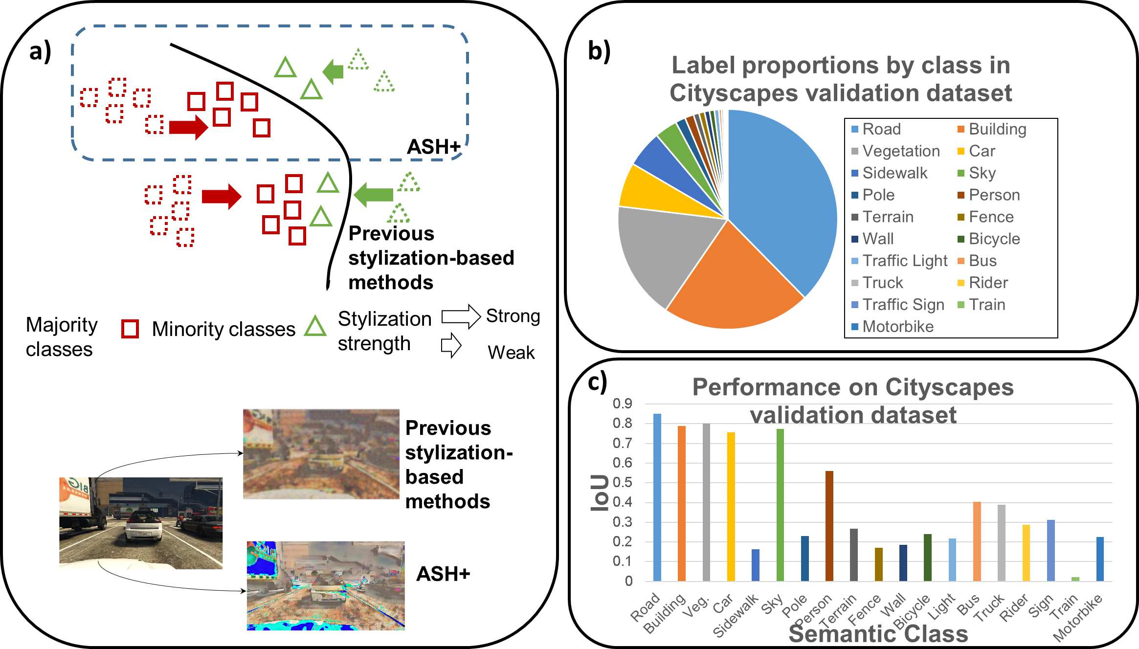 Obtaining sufficient labelled data for model training is impractical for most real-life applications. Therefore, we address the problem of domain generalization for semantic segmentation tasks to reduce the need to acquire and label additional data. Recent work on domain generalization increase data diversity by varying domain-variant features such as colour, style and texture in images. However, excessive stylization or even uniform stylization may reduce performance. Performance reduction is especially pronounced for pixels from minority classes, which are already more challenging to classify compared to pixels from majority classes. Therefore, we introduce a module, $ASH_{+}$, that modulates stylization strength for each pixel depending on the pixel's semantic content. In this work, we also introduce a parameter that balances the element-wise and channel-wise proportion of stylized features with the original source domain features in the stylized source domain images. This learned parameter replaces an empirically determined global hyperparameter, allowing for more fine-grained control over the output stylized image. We conduct multiple experiments to validate the effectiveness of our proposed method. Finally, we evaluate our model on the publicly available benchmark semantic segmentation datasets (Cityscapes and SYNTHIA). Quantitative and qualitative comparisons indicate that our approach is competitive with state-of-the-art. Code is made available at \url{https://github.com/placeholder}
