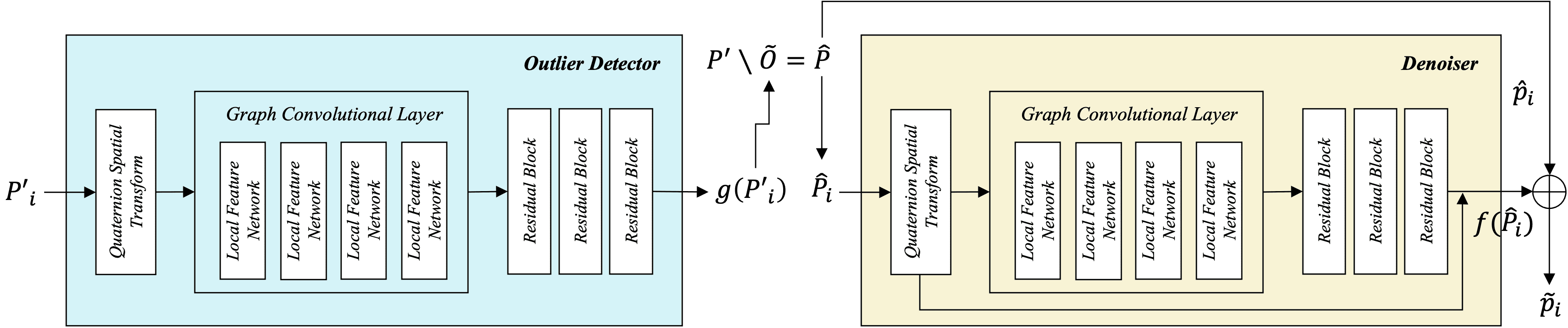 The digitalization of society is rapidly developing toward the realization of the digital twin and metaverse. In particular, point clouds are attracting attention as a media format for 3D space. Point cloud data is contaminated with noise and outliers due to measurement errors. Therefore, denoising and outlier detection are necessary for point cloud processing. Among them, PointCleanNet is an effective method for point cloud denoising and outlier detection. However, it does not consider the local geometric structure of the patch. We solve this problem by applying two types of graph convolutional layer designed based on the Dynamic Graph CNN. Experimental results show that the proposed methods outperform the conventional method in AUPR, which indicates outlier detection accuracy, and Chamfer Distance, which indicates denoising accuracy.