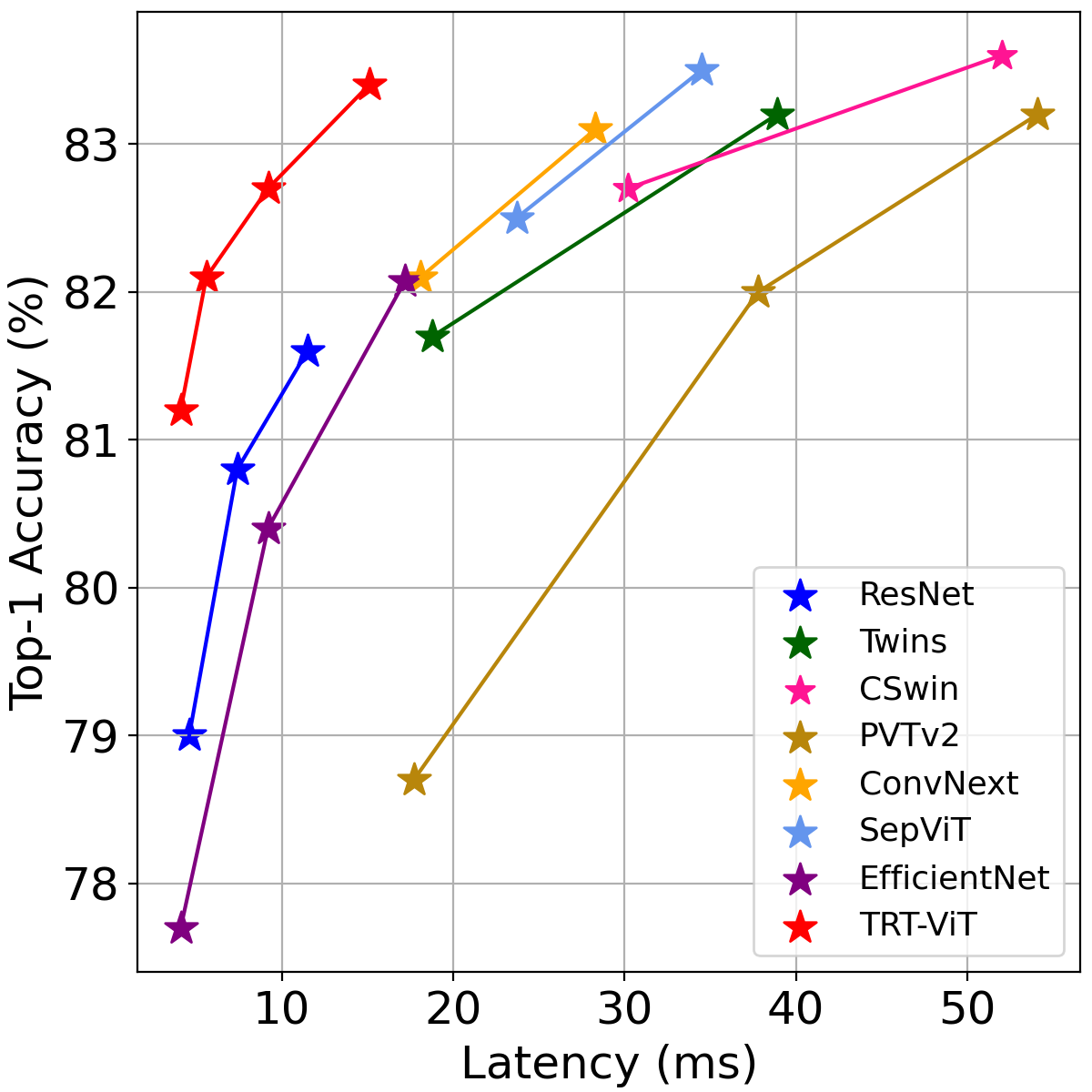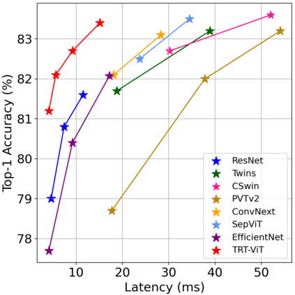 翻译:我们从实际应用的角度重新审视现有的极佳变异器。 大部分变异器甚至不如基本的 ResNet 序列那么高效, 并且偏离了现实的部署设想。 这可能是由于目前测量计算效率的标准, 如 FLOP 或参数是片面的、 亚最佳的和硬件不敏感的。 因此, 本文直接将特定硬件的TensorRT 宽度视为一种效率衡量标准, 它提供了更全面的反馈, 包括计算能力、 记忆成本和带宽。 根据一系列受控实验, 这项工作为TensorRT 和部署友好的物体网络设计提供了四个实用指南。 例如, 早期CNN 和晚变异器在阶段一级、 早期变异器和晚的CNN 。 因此, 以TensortRT 为导向的变异器组合被缩写为TRT- ViT 。 广泛的实验表明, TRT- ViT 大大超出了现有的CVEMNet 和愿景变异器, 与Lative/ centreal Trade- transal- cal- trafferationalations delations delations and lexal- lexal- legal- lex- leg- leg- laves- lex- lax- leg- lax- leg- leg- lax- lex- leg- leg- lax- lax- lex- lex- e- lex- slations- leg- leg- leg- leg- lax