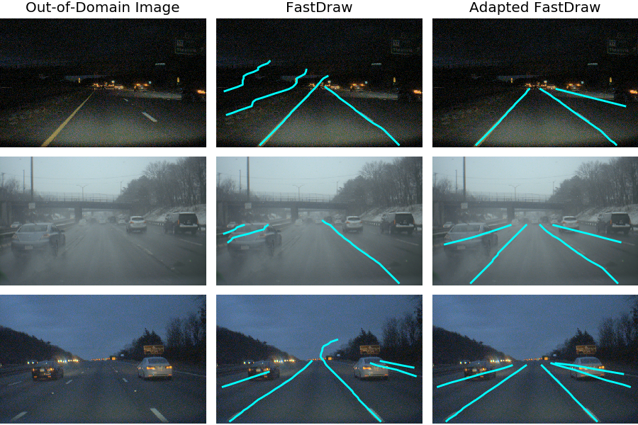 The search for predictive models that generalize to the long tail of sensor inputs is the central difficulty when developing data-driven models for autonomous vehicles. In this paper, we use lane detection to study modeling and training techniques that yield better performance on real world test drives. On the modeling side, we introduce a novel fully convolutional model of lane detection that learns to decode lane structures instead of delegating structure inference to post-processing. In contrast to previous works, our convolutional decoder is able to represent an arbitrary number of lanes per image, preserves the polyline representation of lanes without reducing lanes to polynomials, and draws lanes iteratively without requiring the computational and temporal complexity of recurrent neural networks. Because our model includes an estimate of the joint distribution of neighboring pixels belonging to the same lane, our formulation includes a natural and computationally cheap definition of uncertainty. On the training side, we demonstrate a simple yet effective approach to adapt the model to new environments using unsupervised style transfer. By training FastDraw to make predictions of lane structure that are invariant to low-level stylistic differences between images, we achieve strong performance at test time in weather and lighting conditions that deviate substantially from those of the annotated datasets that are publicly available. We quantitatively evaluate our approach on the CVPR 2017 Tusimple lane marking challenge, difficult CULane datasets, and a small labeled dataset of our own and achieve competitive accuracy while running at 90 FPS.