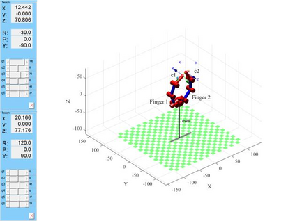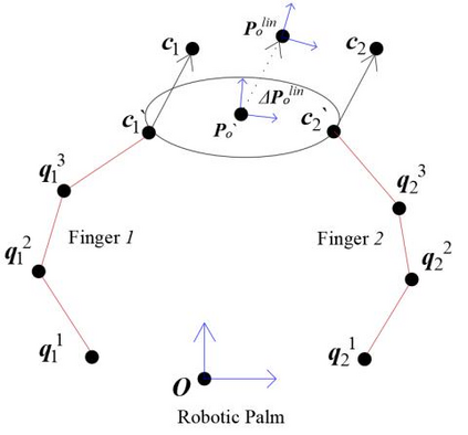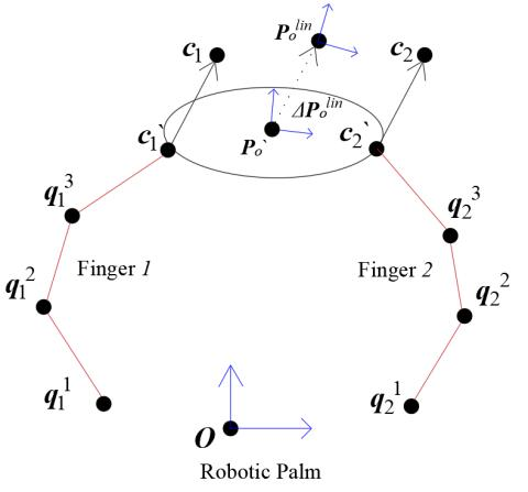 This paper addresses the planar finger kinematics for seeking optimized manipulation strategies. The first step is to model based on geometric features of linear and rotation motion so that the robot can select the fingers configurations. This kinematic model considers the motion between hands and object. Based on 2-finger manipulation cases, this model can output the strategies for bimanual manipulation. For executing strategies, the second step is to seek the appropriate values of finger joints according to the ending orientation of fingers. The simulation shows that the computed solutions can complete the relative rotation and linear motion of unknown objects.