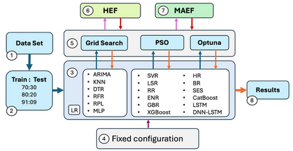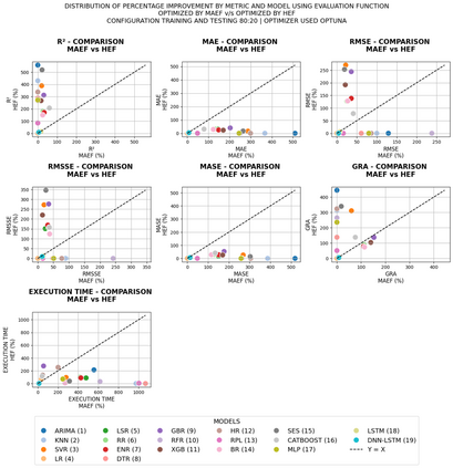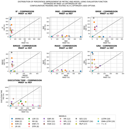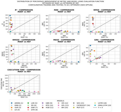 Demand forecasting in competitive and uncertain business environments requires models that can integrate multiple evaluation perspectives, rather than being restricted to hyperparameter optimization through a single metric. This traditional approach tends to prioritize one error indicator, which can bias results when metrics provide contradictory signals. In this context, the Hierarchical Evaluation Function (HEF) is proposed as a multi-metric framework for hyperparameter optimization that integrates explanatory power (R2), sensitivity to extreme errors (RMSE), and average accuracy (MAE). The performance of HEF was assessed using four widely recognized benchmark datasets in the forecasting domain: the Walmart, M3, M4, and M5 datasets. Prediction models were optimized through Grid Search, Particle Swarm Optimization (PSO), and Optuna, and statistical analyses based on difference-of-proportions tests confirmed that HEF delivers superior results compared to a unimetric reference function, regardless of the optimizer employed, with particular relevance for heterogeneous monthly time series (M3) and highly granular daily demand scenarios (M5). The findings demonstrate that HEF improves stability, generalization, and robustness at a low computational cost, consolidating its role as a reliable evaluation framework that enhances model selection, enables more accurate demand forecasts, and supports decision-making in dynamic and competitive business environments.