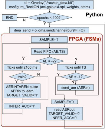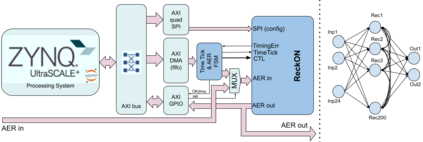 With the rise of artificial intelligence, biological neuron models are being used to implement neural networks that can learn certain tasks after a training phase. One type of such networks are spiking neural networks (SNNs) that rely on a simplified model for biological neurons, the Integrate and Fire neuron. Several accelerators have emerged to implement SNNs with this kind of neuron. The ReckON system is one of these that allows both the training and execution of a recurrent SNN. The ReckON architecture, implemented on a custom ASIC, can be fully described using a hardware description language. In this work, we adapt the Verilog description to implement it on a Xilinx Multiprocessor System on Chip system (MPSoC). We present the circuits required for the efficient operation of the system, and a Python framework to use it on the Pynq ZU platform. We validate the architecture and implementation in two different scenarios, and show how the simulated accuracy is preserved with a peak performance of 3.8M events processed per second.