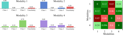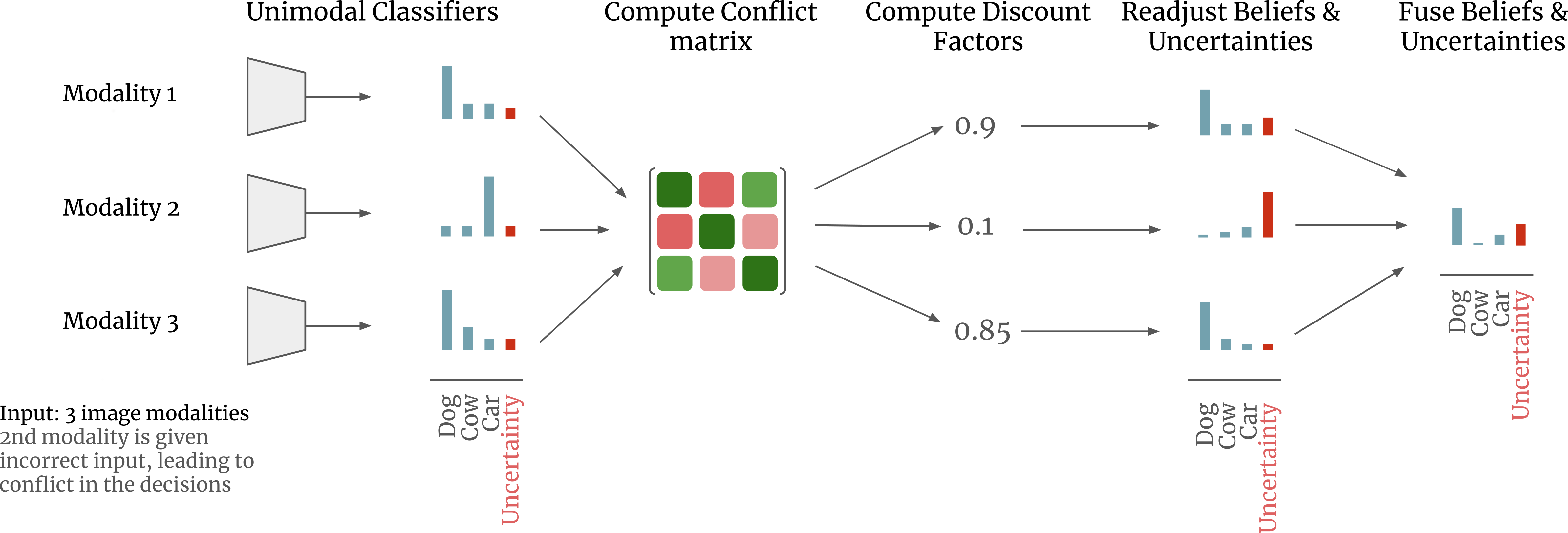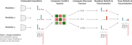 Multimodal AI models are increasingly used in fields like healthcare, finance, and autonomous driving, where information is drawn from multiple sources or modalities such as images, texts, audios, videos. However, effectively managing uncertainty - arising from noise, insufficient evidence, or conflicts between modalities - is crucial for reliable decision-making. Current uncertainty-aware machine learning methods leveraging, for example, evidence averaging, or evidence accumulation underestimate uncertainties in high-conflict scenarios. Moreover, the state-of-the-art evidence averaging strategy is not order invariant and fails to scale to multiple modalities. To address these challenges, we propose a novel multimodal learning method with order-invariant evidence fusion and introduce a conflict-based discounting mechanism that reallocates uncertain mass when unreliable modalities are detected. We provide both theoretical analysis and experimental validation, demonstrating that unlike the previous work, the proposed approach effectively distinguishes between conflicting and non-conflicting samples based on the provided uncertainty estimates, and outperforms the previous models in uncertainty-based conflict detection.