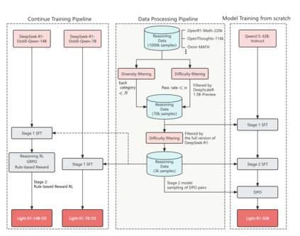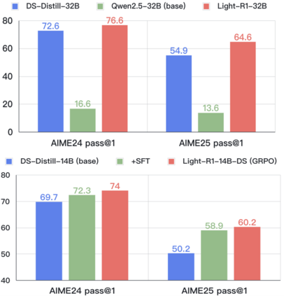This paper introduces Light-R1, an open-source suite for training long reasoning models using reproducible and cost-effective methodology. Given the proprietary nature of data used in the DeepSeek-R1 series, we develop an alternative approach leveraging exclusively public data and models. Our curriculum training progressively increases data difficulty, combined with multi-staged post-training. Our Light-R1-32B model, trained from Qwen2.5-32B-Instruct, outperforms DeepSeek-R1-Distill-Qwen-32B in math reasoning. Experimental results show that this curriculum approach becomes more effective when distinct, diverse datasets are available for different training stages: fine-tuning DeepSeek-R1-Distilled models (pre-tuned by DeepSeek team on proprietary data) with 3,000 challenging examples from our curriculum dataset yielded state-of-the-art 7B and 14B models, while the 32B model, Light-R1-32B-DS performed comparably to QwQ-32B and DeepSeek-R1. Furthermore, we extend our work by applying GRPO on long reasoning models. Our final Light-R1-14B-DS achieves SOTA performance among 14B models in math, with AIME24 \& 25 scores of 74.0 and 60.2 respectively, surpassing many 32B models and DeepSeek-R1-Distill-Llama-70B. Despite math-focused training, Light-R1-14B-DS demonstrates strong cross-domain generalization. Light-R1 represents a significant advancement in making sophisticated reasoning models more accessible and implementable in real-world applications. Our models, training data and code have been made available at https://github.com/Qihoo360/Light-R1.