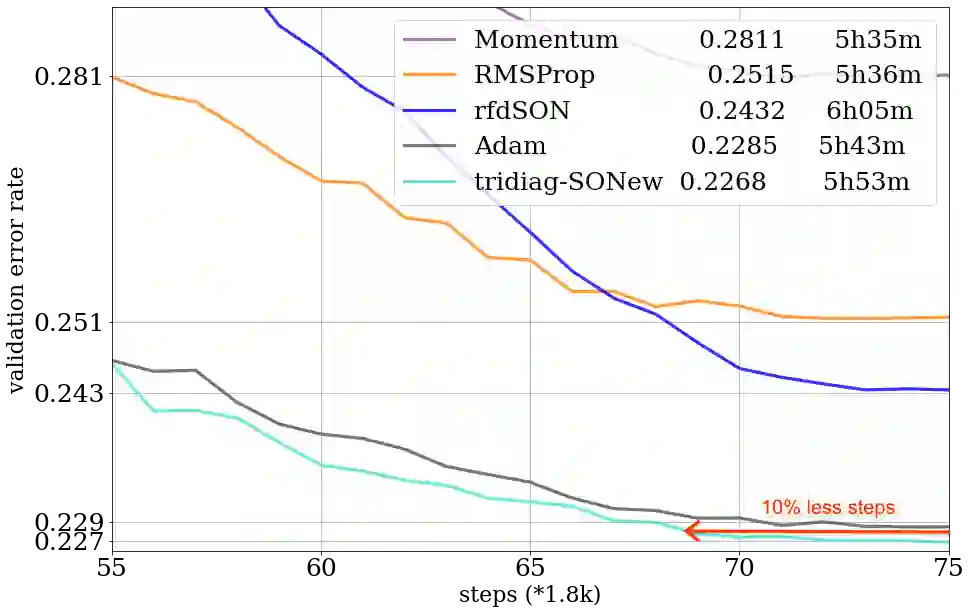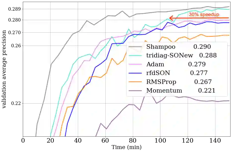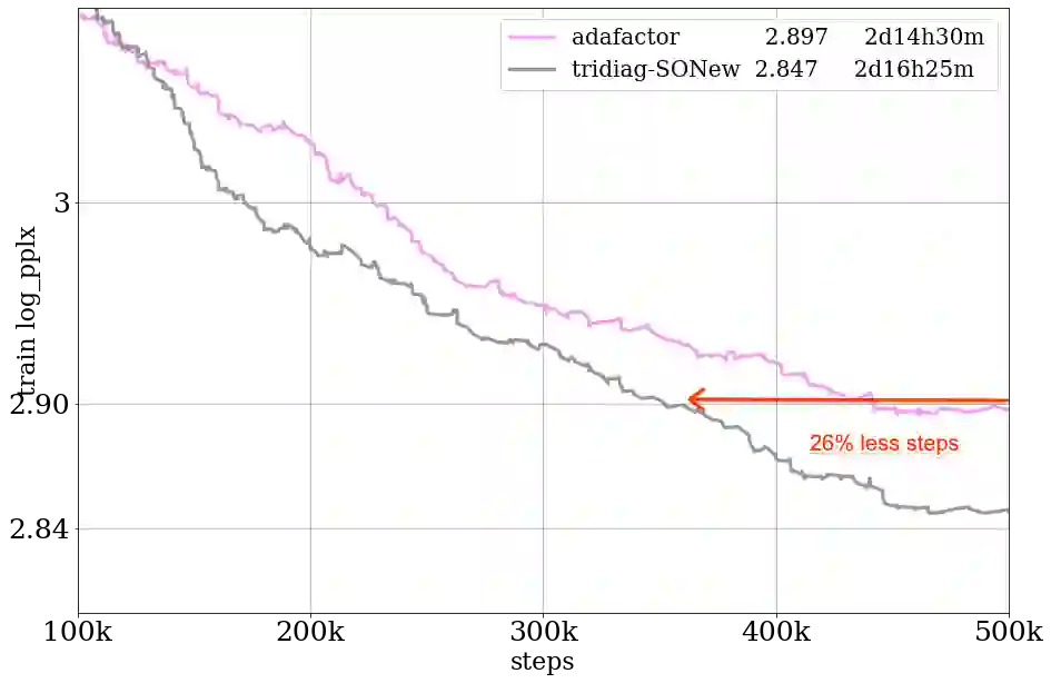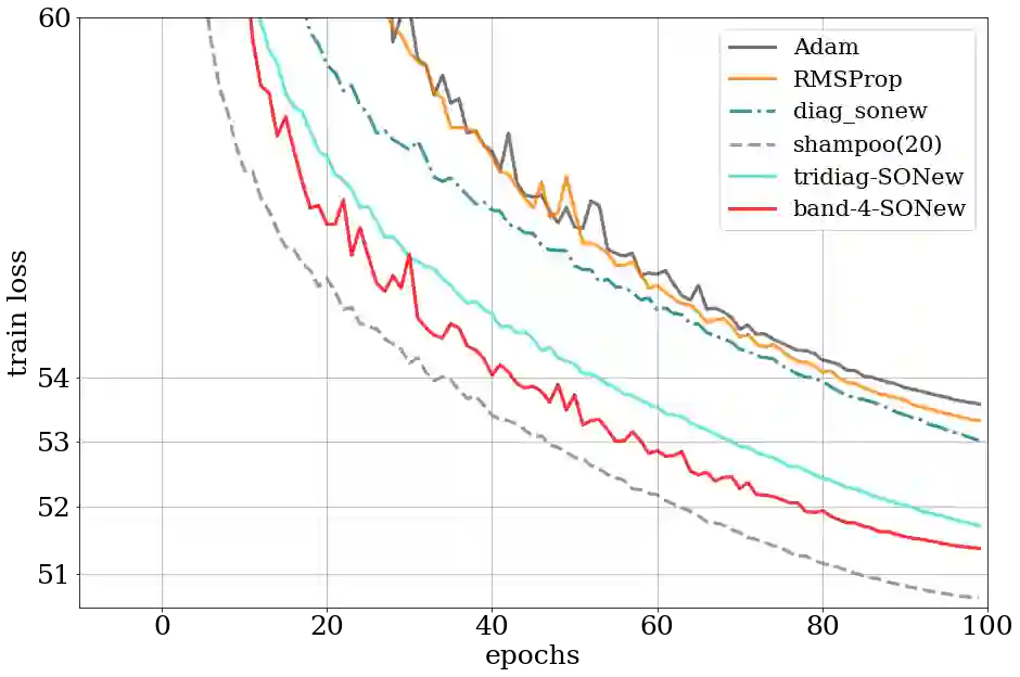 Second-order methods hold significant promise for enhancing the convergence of deep neural network training; however, their large memory and computational demands have limited their practicality. Thus there is a need for scalable second-order methods that can efficiently train large models. In this paper, we introduce the Sparsified Online Newton (SONew) method, a memory-efficient second-order algorithm that yields a sparsified yet effective preconditioner. The algorithm emerges from a novel use of the LogDet matrix divergence measure; we combine it with sparsity constraints to minimize regret in the online convex optimization framework. Empirically, we test our method on large scale benchmarks of up to 1B parameters. We achieve up to 30% faster convergence, 3.4% relative improvement in validation performance, and 80% relative improvement in training loss, in comparison to memory efficient optimizers including first order methods. Powering the method is a surprising fact -- imposing structured sparsity patterns, like tridiagonal and banded structure, requires little to no overhead, making it as efficient and parallelizable as first-order methods. In wall-clock time, tridiagonal SONew is only about 3% slower per step than first-order methods but gives overall gains due to much faster convergence. In contrast, one of the state-of-the-art (SOTA) memory-intensive second-order methods, Shampoo, is unable to scale to large benchmarks. Additionally, while Shampoo necessitates significant engineering efforts to scale to large benchmarks, SONew offers a more straightforward implementation, increasing its practical appeal. SONew code is available at: https://github.com/devvrit/SONew