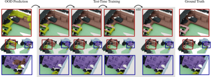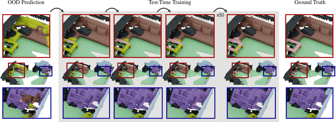 Test-Time Training (TTT) proposes to adapt a pre-trained network to changing data distributions on-the-fly. In this work, we propose the first TTT method for 3D semantic segmentation, TTT-KD, which models Knowledge Distillation (KD) from foundation models (e.g. DINOv2) as a self-supervised objective for adaptation to distribution shifts at test-time. Given access to paired image-pointcloud (2D-3D) data, we first optimize a 3D segmentation backbone for the main task of semantic segmentation using the pointclouds and the task of 2D $\to$ 3D KD by using an off-the-shelf 2D pre-trained foundation model. At test-time, our TTT-KD updates the 3D segmentation backbone for each test sample, by using the self-supervised task of knowledge distillation, before performing the final prediction. Extensive evaluations on multiple indoor and outdoor 3D segmentation benchmarks show the utility of TTT-KD, as it improves performance for both in-distribution (ID) and out-of-distribution (ODO) test datasets. We achieve a gain of up to 13% mIoU (7% on average) when the train and test distributions are similar and up to 45% (20% on average) when adapting to OOD test samples.