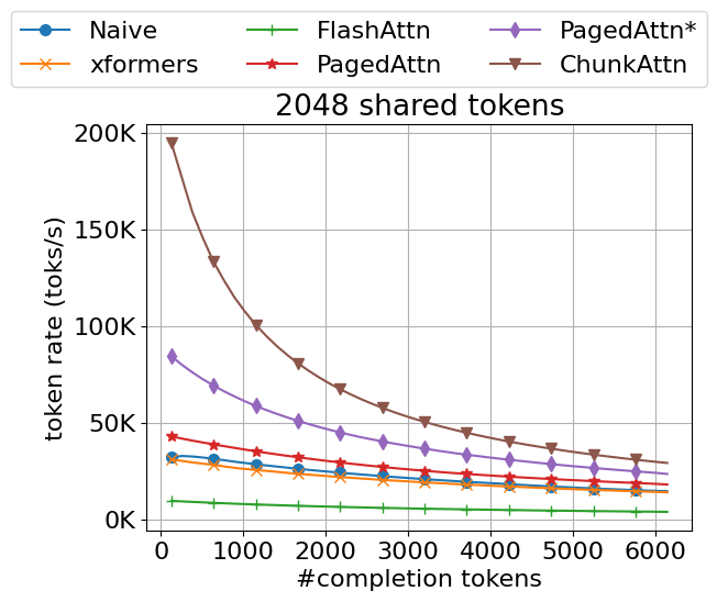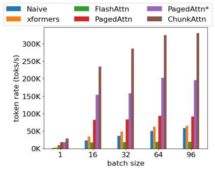 Self-attention is an essential component of large language models (LLM) but a significant source of inference latency for long sequences. In multi-tenant LLM serving scenarios, the compute and memory operation cost of self-attention can be optimized by using the probability that multiple LLM requests have shared system prompts in prefixes. In this paper, we introduce ChunkAttention, a prefix-aware self-attention module that can detect matching prompt prefixes across multiple requests and share their key/value tensors in memory at runtime to improve the memory utilization of KV cache. This is achieved by breaking monolithic key/value tensors into smaller chunks and structuring them into the auxiliary prefix tree. Consequently, on top of the prefix-tree based KV cache, we design an efficient self-attention kernel, where a two-phase partition algorithm is implemented to improve the data locality during self-attention computation in the presence of shared system prompts. Experiments show that ChunkAttention can speed up the self-attention kernel by 3.2-4.8$\times$ compared to the state-of-the-art implementation, with the length of the system prompt ranging from 1024 to 4096.